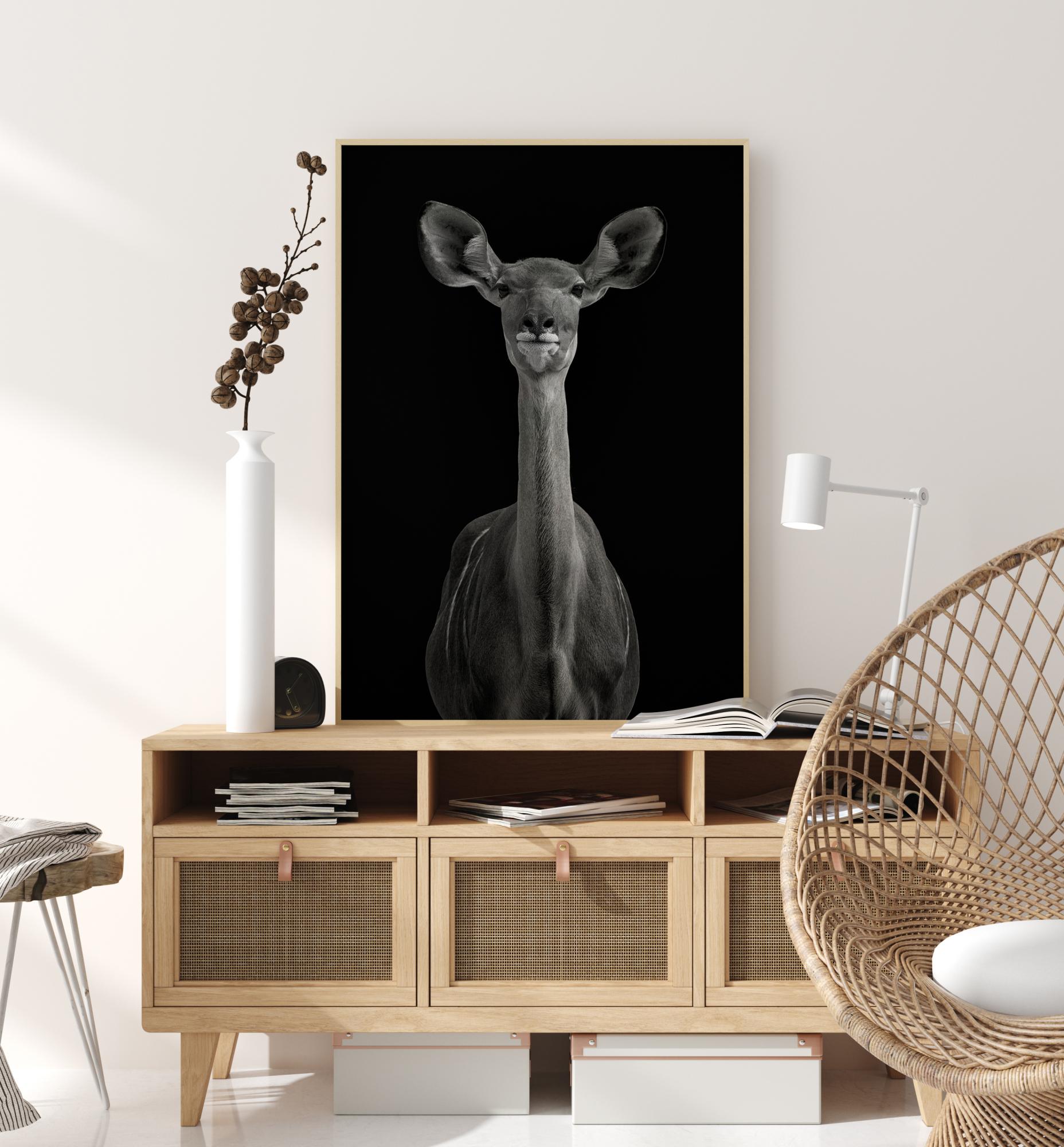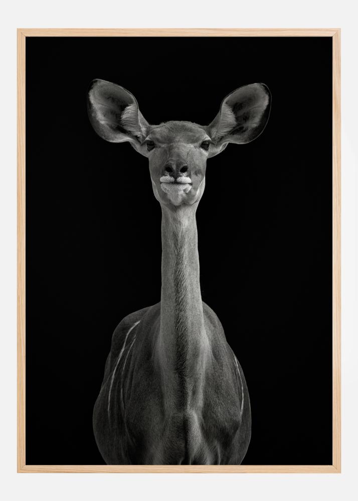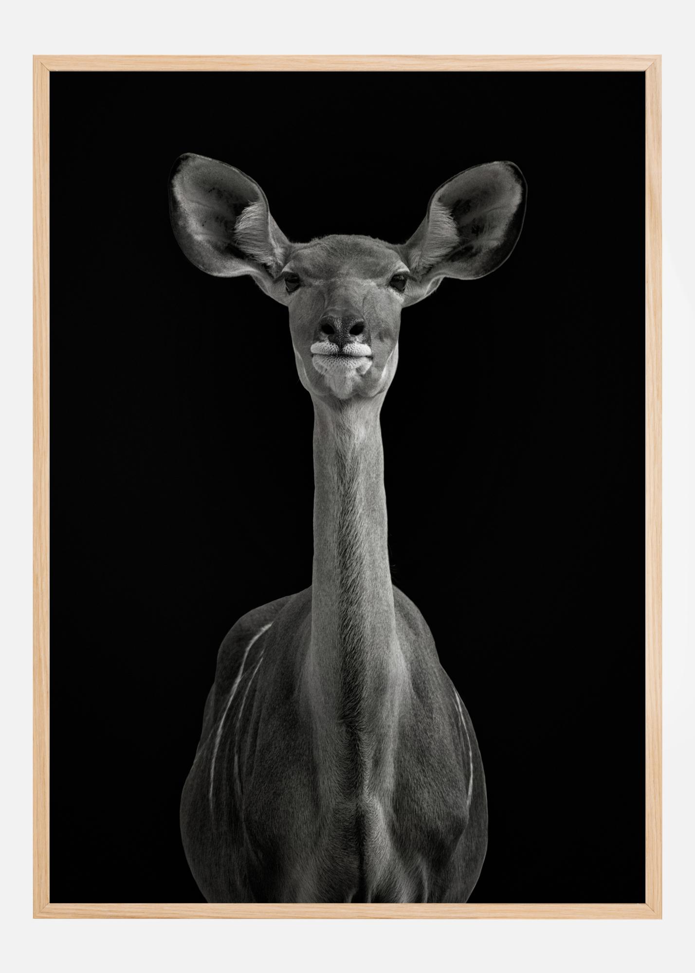 Čudovit portret antilope na globoko črnem ozadju. Antilopa se obrne proti kameri, z ušesi obrnjenimi naprej, ko gleda in posluša. Njen vrat je dolg in tanek, njene oči pa mehke. Združite z drugim živalskim tiskom za ustvarjanje čudovitega zoološkega občutka.