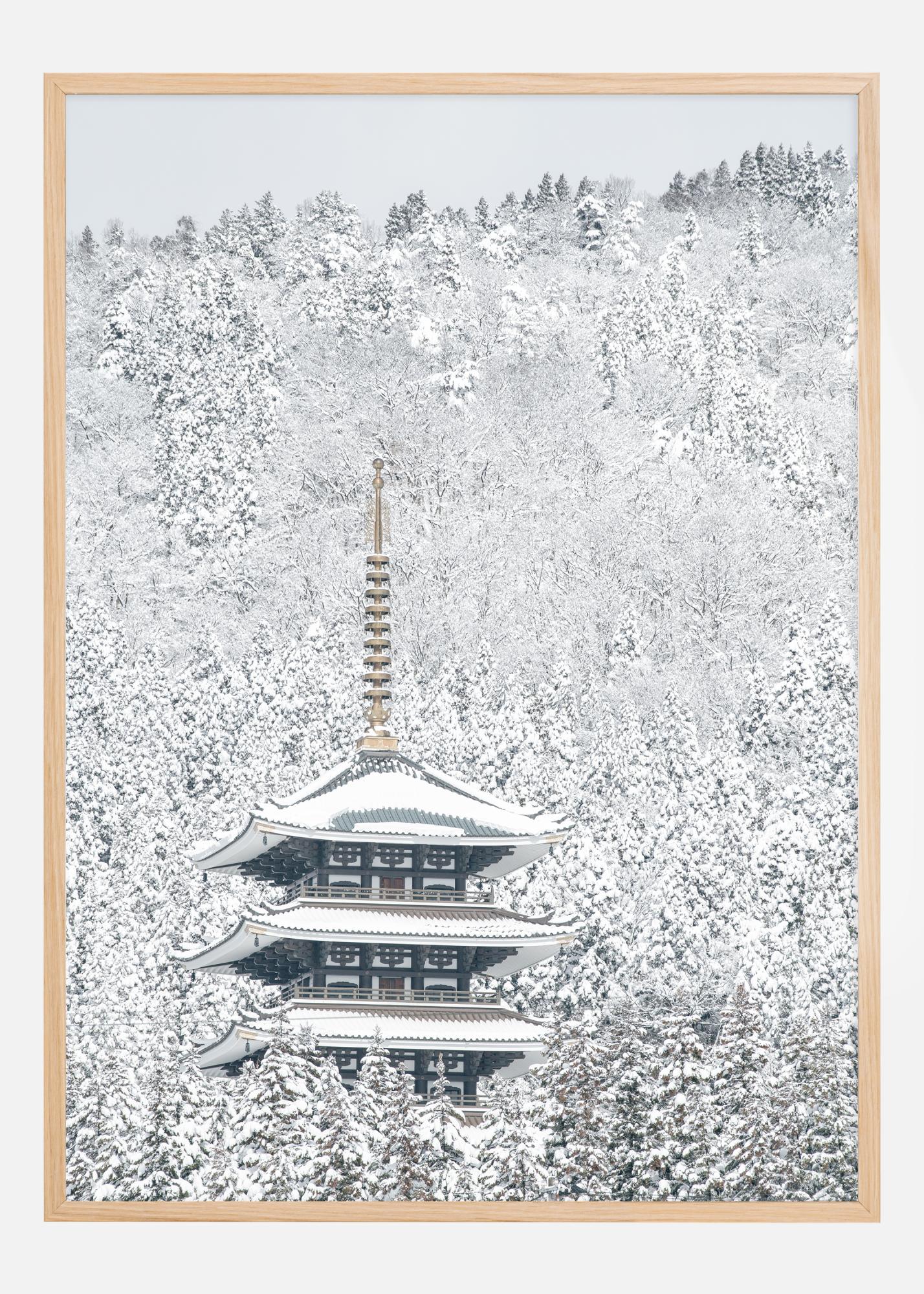 Ta atmosferski poster vzbuja miren občutek zimsko oblečene pokrajine, kjer tradicionalna vzhodnoazijska pagoda stoji veličastno obkrožena z morjem snežno obteženih dreves. Subtilen kontrast med delikatno arhitekturo in mogočnimi, bujnimi drevesi, ki so vsi zaviti v debelo plast snega, ustvarja podobo tišine in osamljenosti. Ta print popolnoma ujame osamljeno lepoto zimske narave, kjer se odtenki bele barve razlikujejo od močne, sveteče svetlobe do mehkih, pridušenih tonov.
