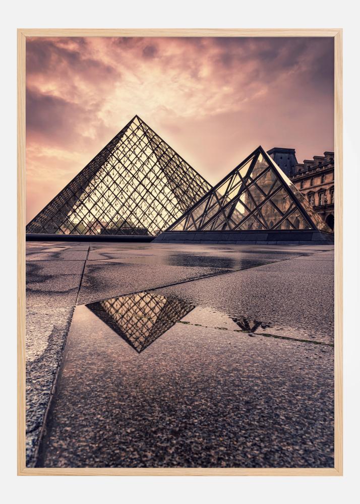 Ta sodobna plakat upodablja ikonične geometrijske oblike slavne strukture, ki se odražajo v luži vode. Kovinsko sijoče trikotnike in steklene plošče so zajeti v drzno perspektivo, z nebom, poslikanim v mehkih odtenkih vijolične in roza barve, kot zadnja svetloba mraka. Barvna paleta sega od hladnih sivih in srebrnih tonov do toplih bakrenih tonov, kar odraža tako trajnost konstrukcije kot tudi minljivo lepoto neba.