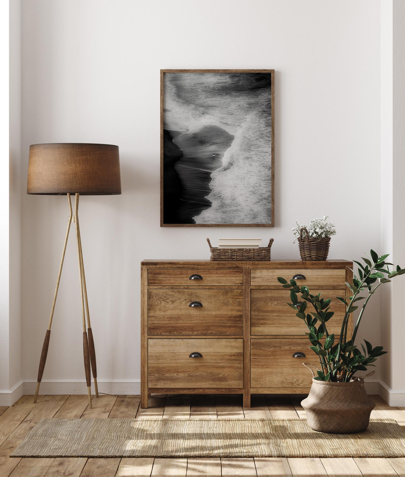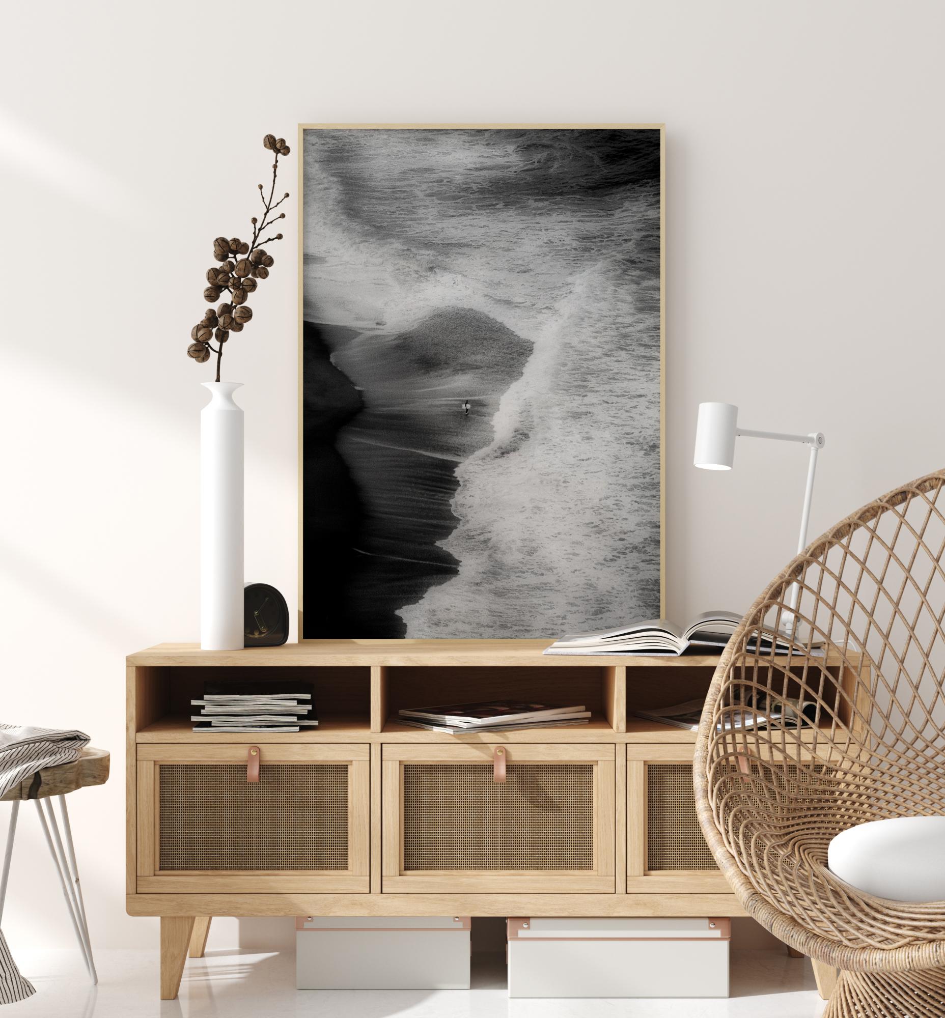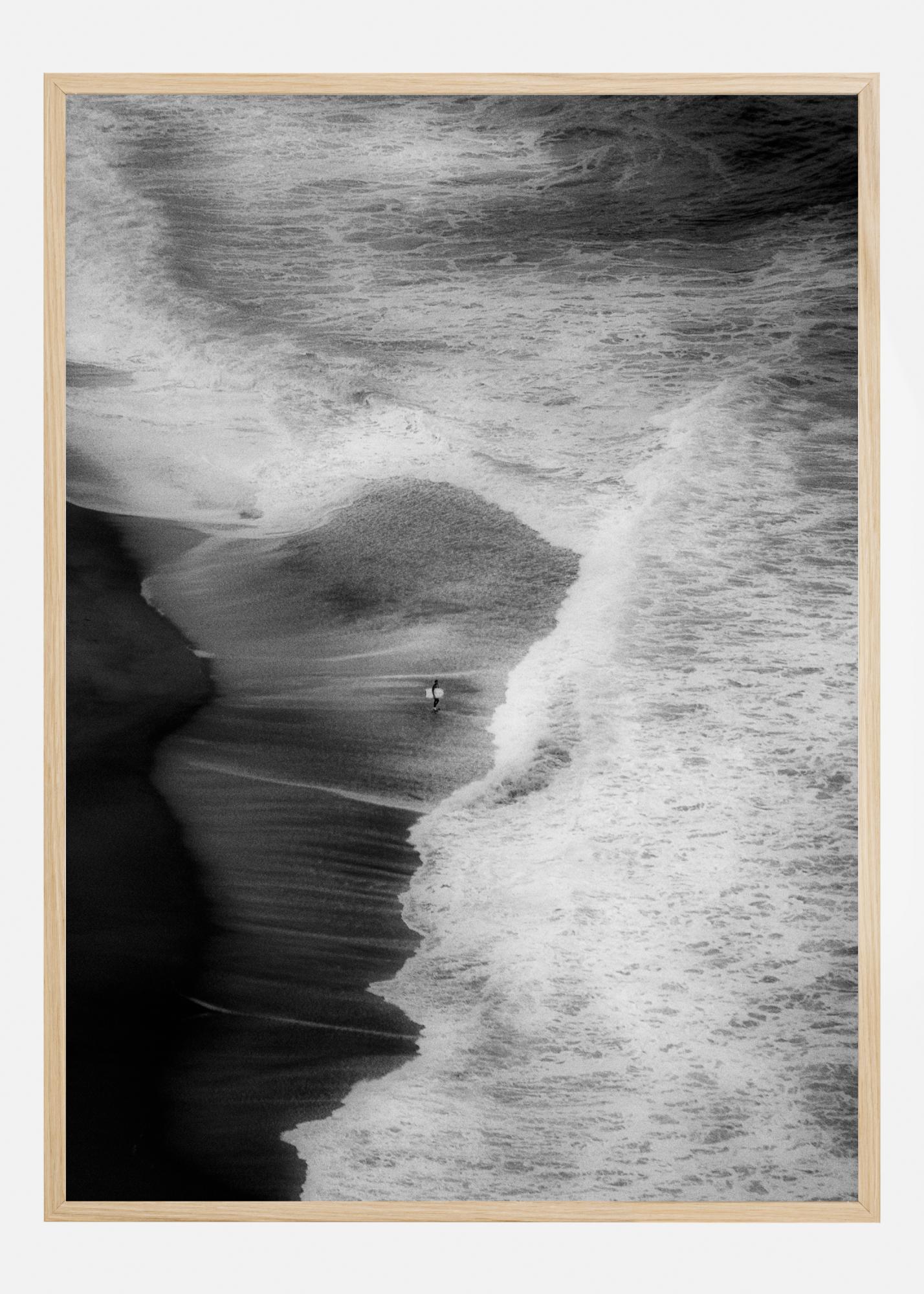 Plakat s plažo in deskanjem iz zraka. Ta abstraktna slika prikazuje veličino narave, ko valovi dosežejo plažo - osamljen deskar predstavlja fokusno točko v sliki.
