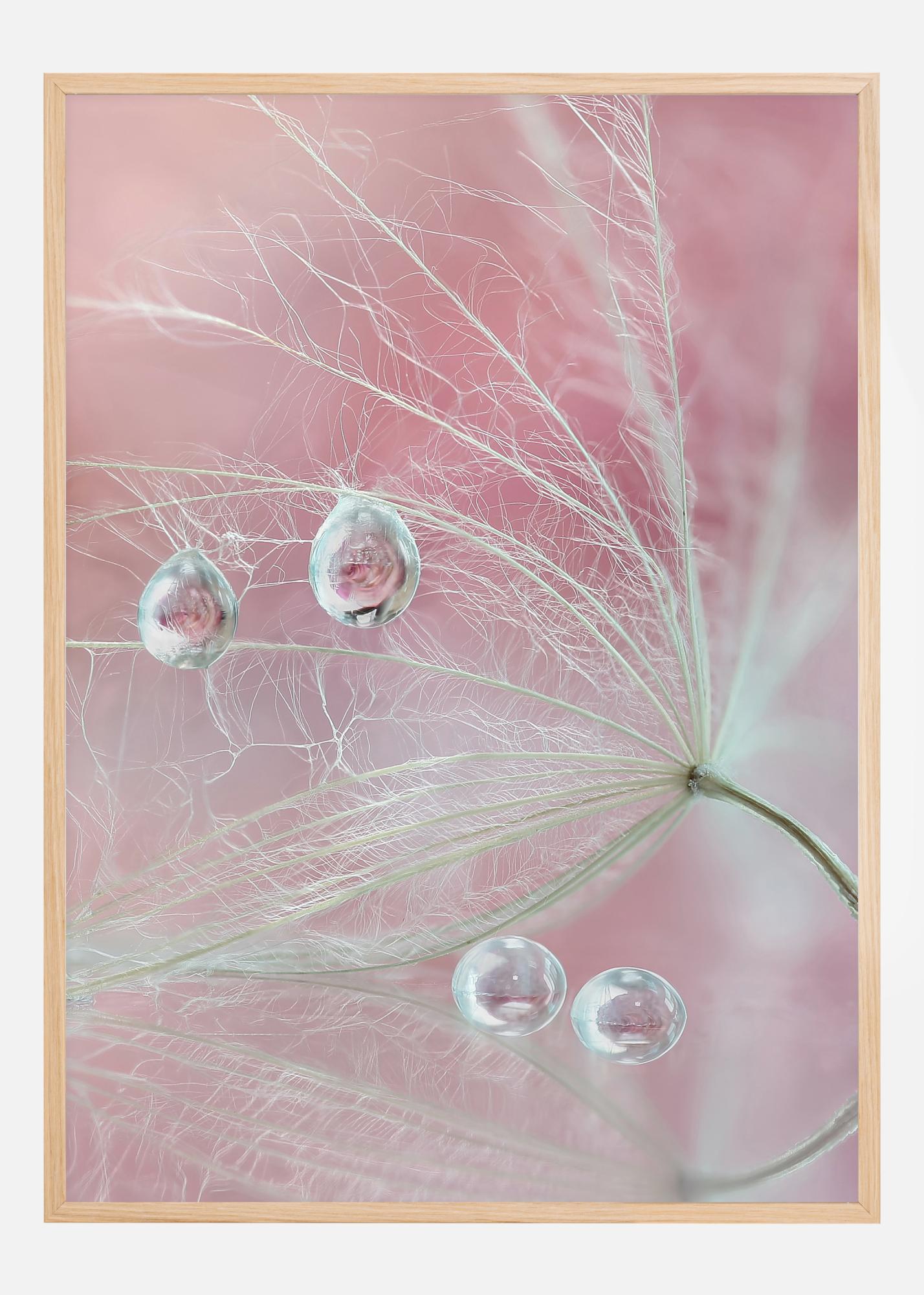 Eleganten plakat z pajkasto cvetno glavo, z dvema vodnima kapljicama na občutljivih pernatih konicah. Svetlo roza ozadje sije skozi vsako od popolnih vodnih kapljic, ko visijo tik preden spustijo s cveta. Uživajte v občutljivem ravnovesju narave.