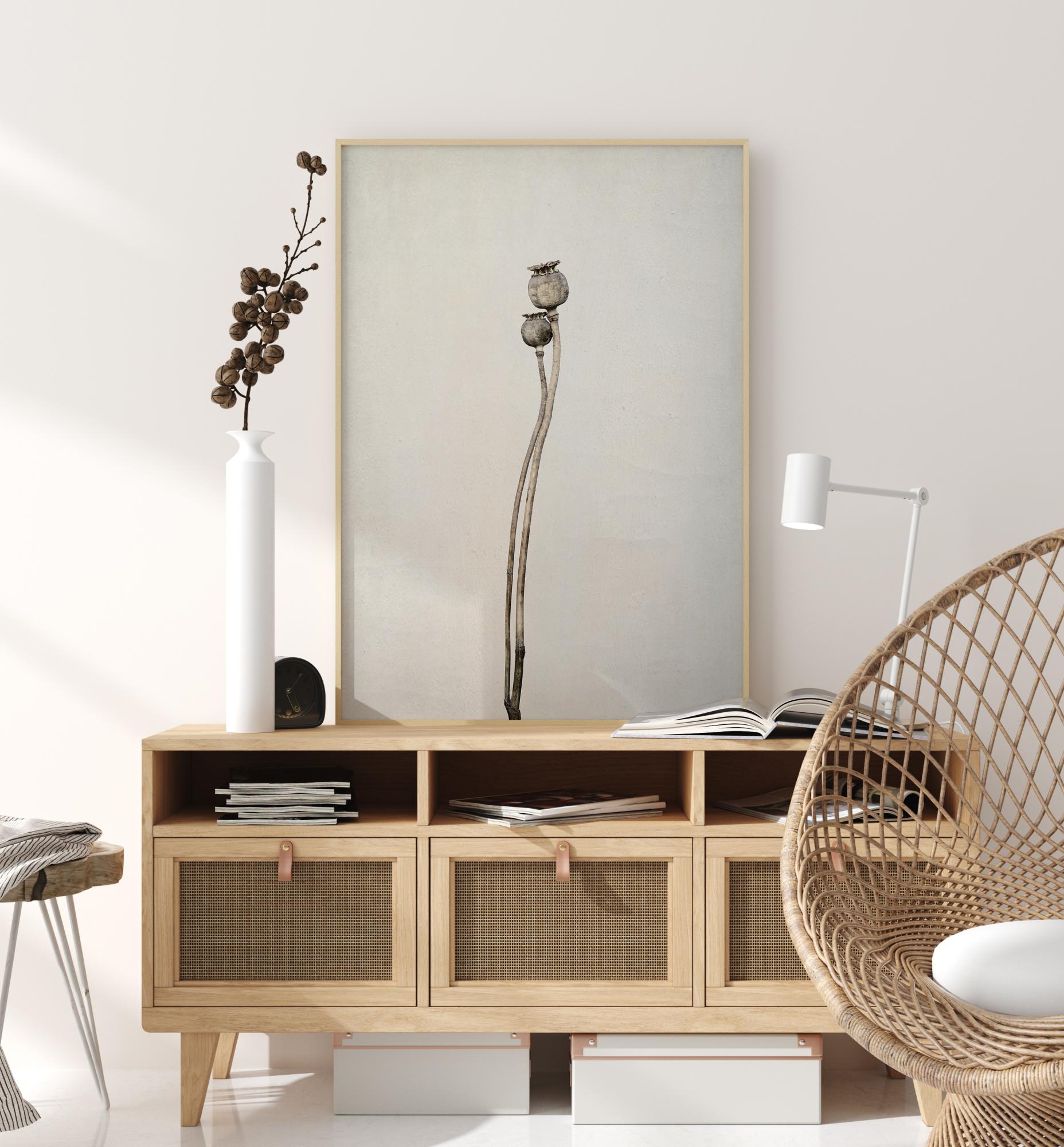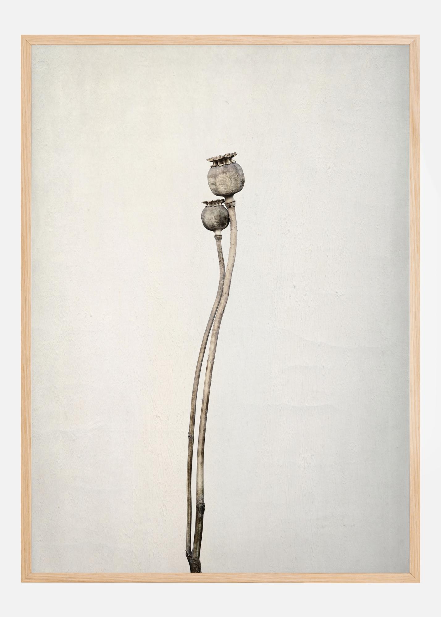 Cvetlični poster z dvema makovima semenskima nastavkoma, prepletenima v ples. Črno-bela slika ima ti dve dolgonogi makovi semeni, ki se vrtita proti beli podlagi. Ta eleganten ples pritegne pozornost, ko se ta makova glavica pripravlja, da poči in razprši svoja semena za rast novih cvetov.