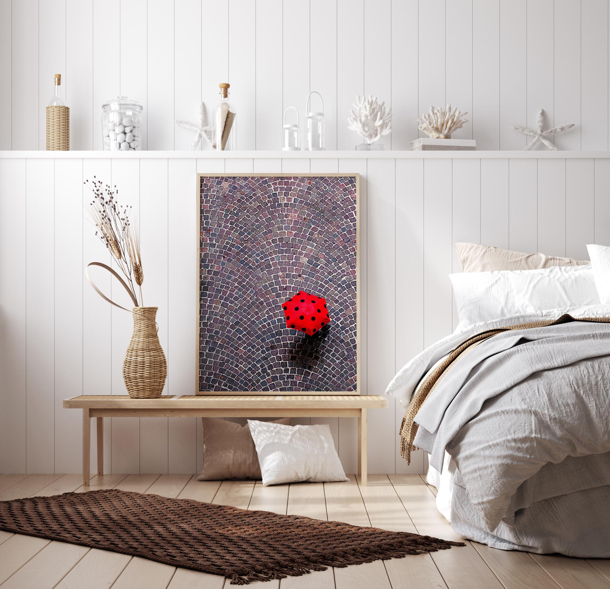 Mestni plakat s pločnikom iz ptičje perspektive. Svetlo rdeč dežnik s črnimi pikami ustvarja svetlo točko na modri in vijolični mozaik talni plošči. Dežnik, ki je videti kot pikapolonica, ustvarja zabavno središčno točko v tej vzorčasti in tesselirajoči sliki.