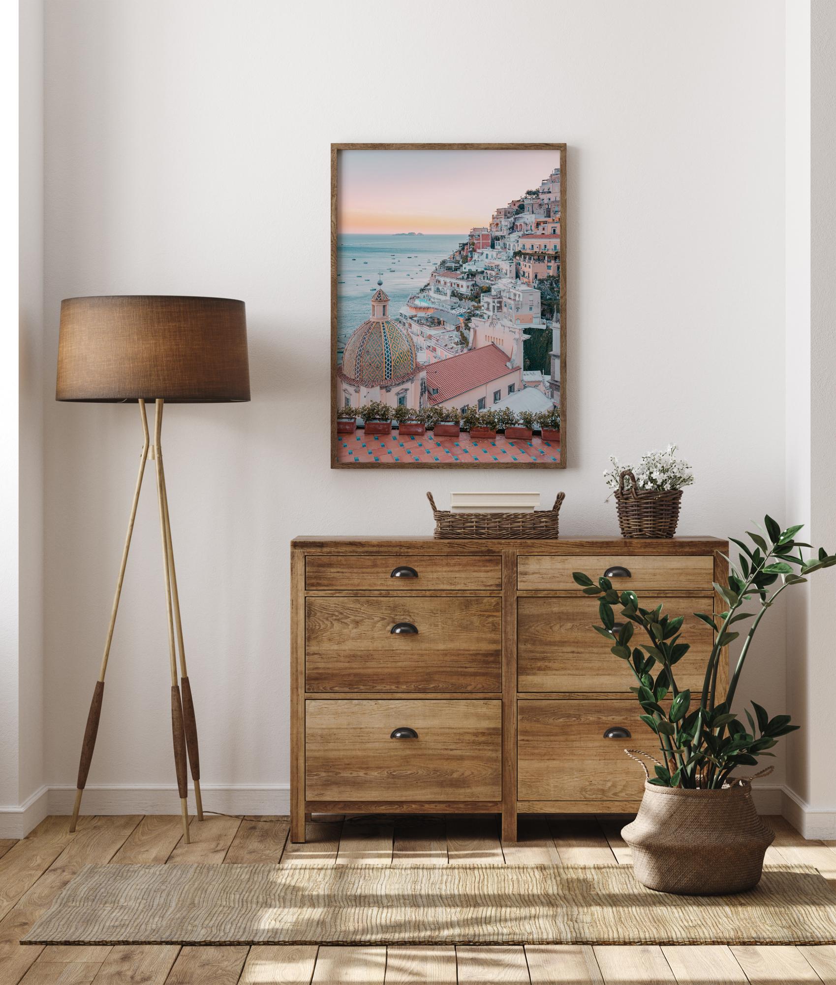 Plakat za potovanje z mestom ob morju. Mehke bele in pastelne hiše ustvarjajo občutek počitnic v tem sredozemskem okolju. Svetlo modro morje se razteza daleč naokrog in je polno majhnih ribiških čolnov. Sončni vzhod je viden tik nad obzorjem in meče toplo svetlobo čez sliko.