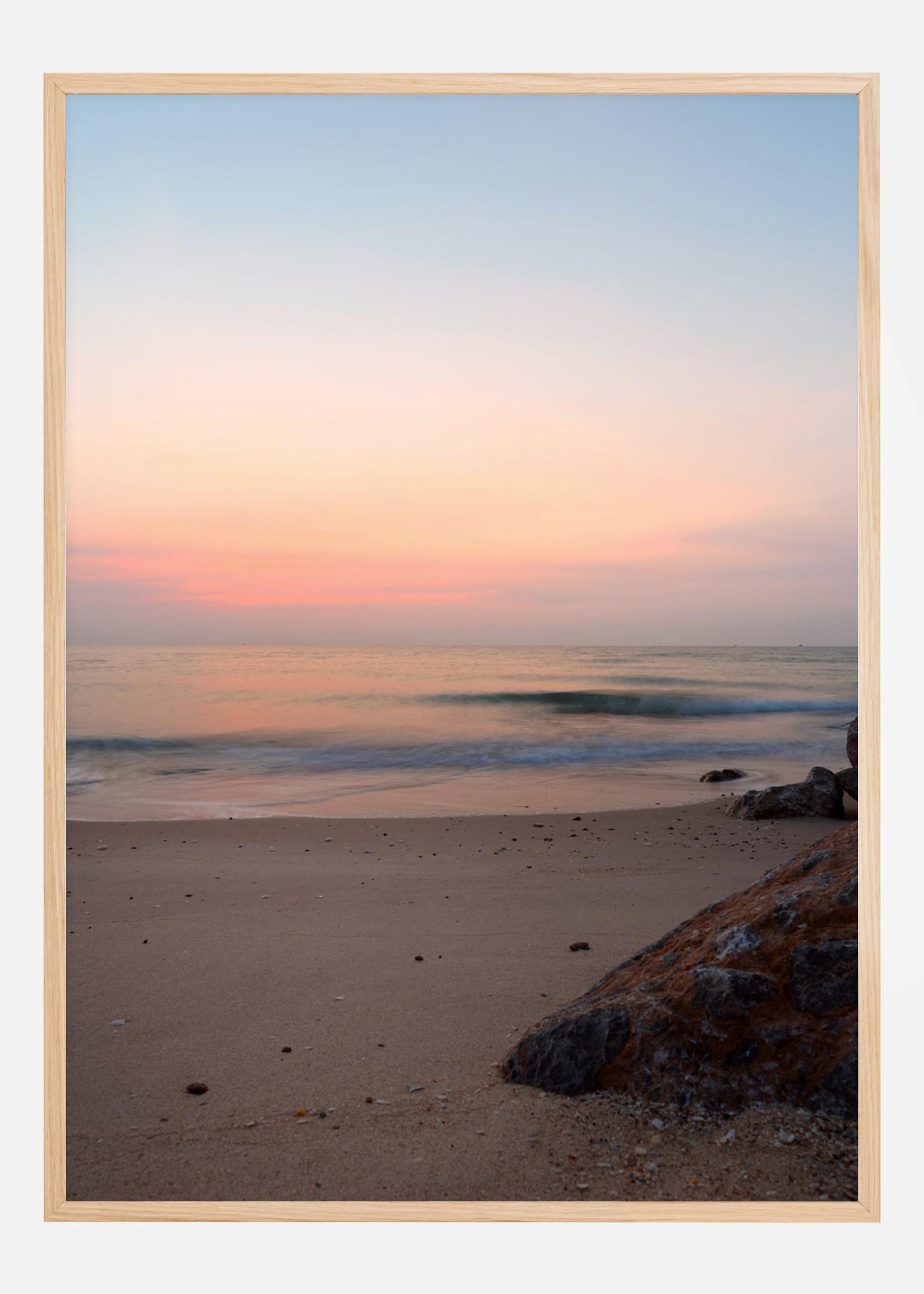 Plakat s široko peščeno plažo in mirnim morjem v ozadju. Nežen sončni vzhod kuka nad obzorjem in meče mehko rožnato in modro svetlobo nad morjem. Privoščite si občutek počitnic s to mirno in spokojno plažno sceno.