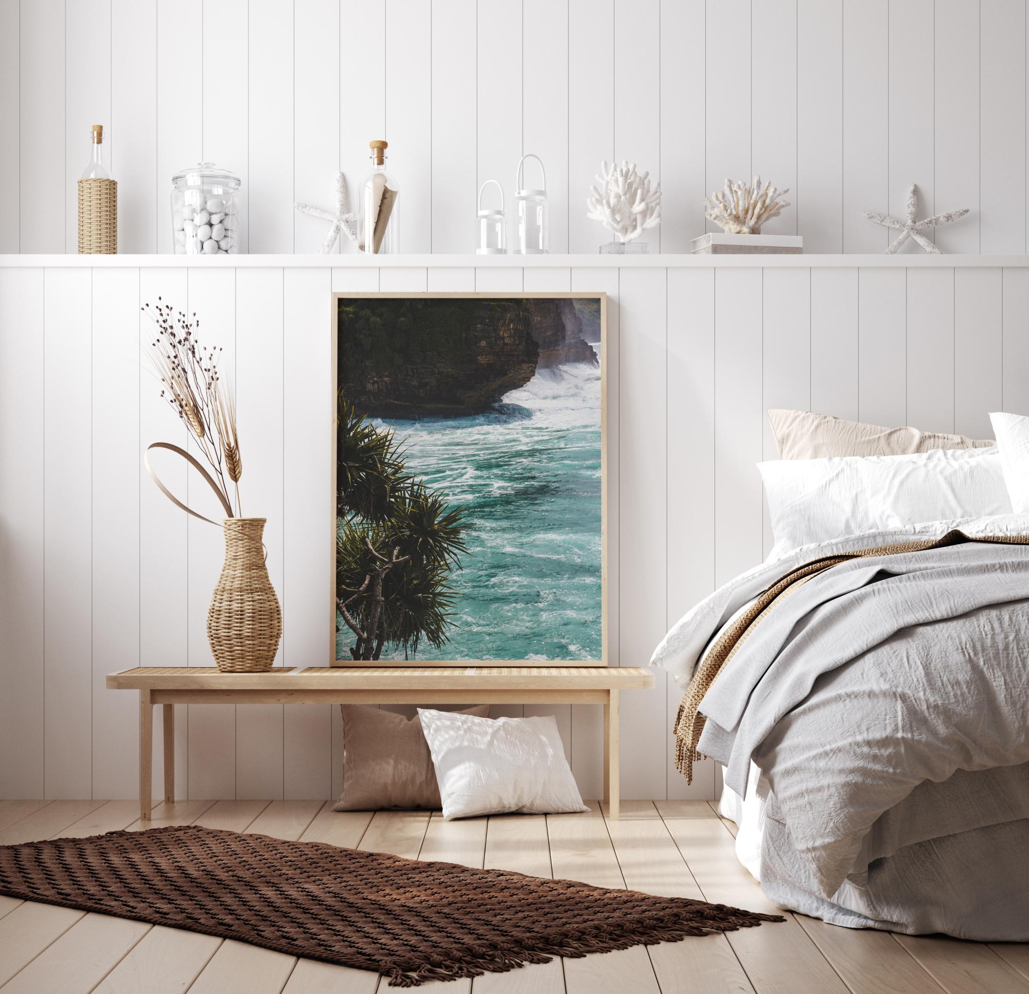 Tropski plakat z morjem, ki udarja ob dno pečin. Skupina palm piha v vetru na levi strani slike, da ji da bolj eksotičen občutek. Občutite toplino v tem svetlo modrem prizoru in si predstavljajte svoj popoln dopust.