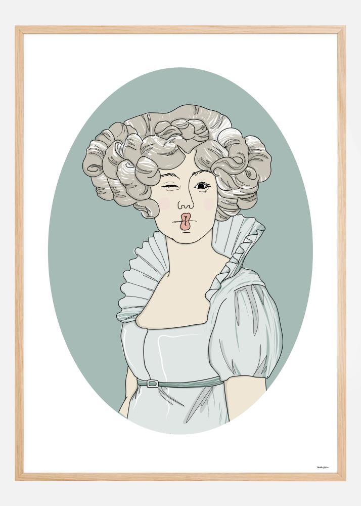Drzna poster z viktorijansko Violeto, ki ležerno pomežikne iz slike z ustnicami, stisnjenimi v poljub. Njeni sivi kodri se ujemajo z mehko modro-sivo obleko z visokim ovratnikom. Slika je tudi v modrem ovalu, da posnema stare male medaljone in ustvarja edinstveno, nenavadno umetniško delo.