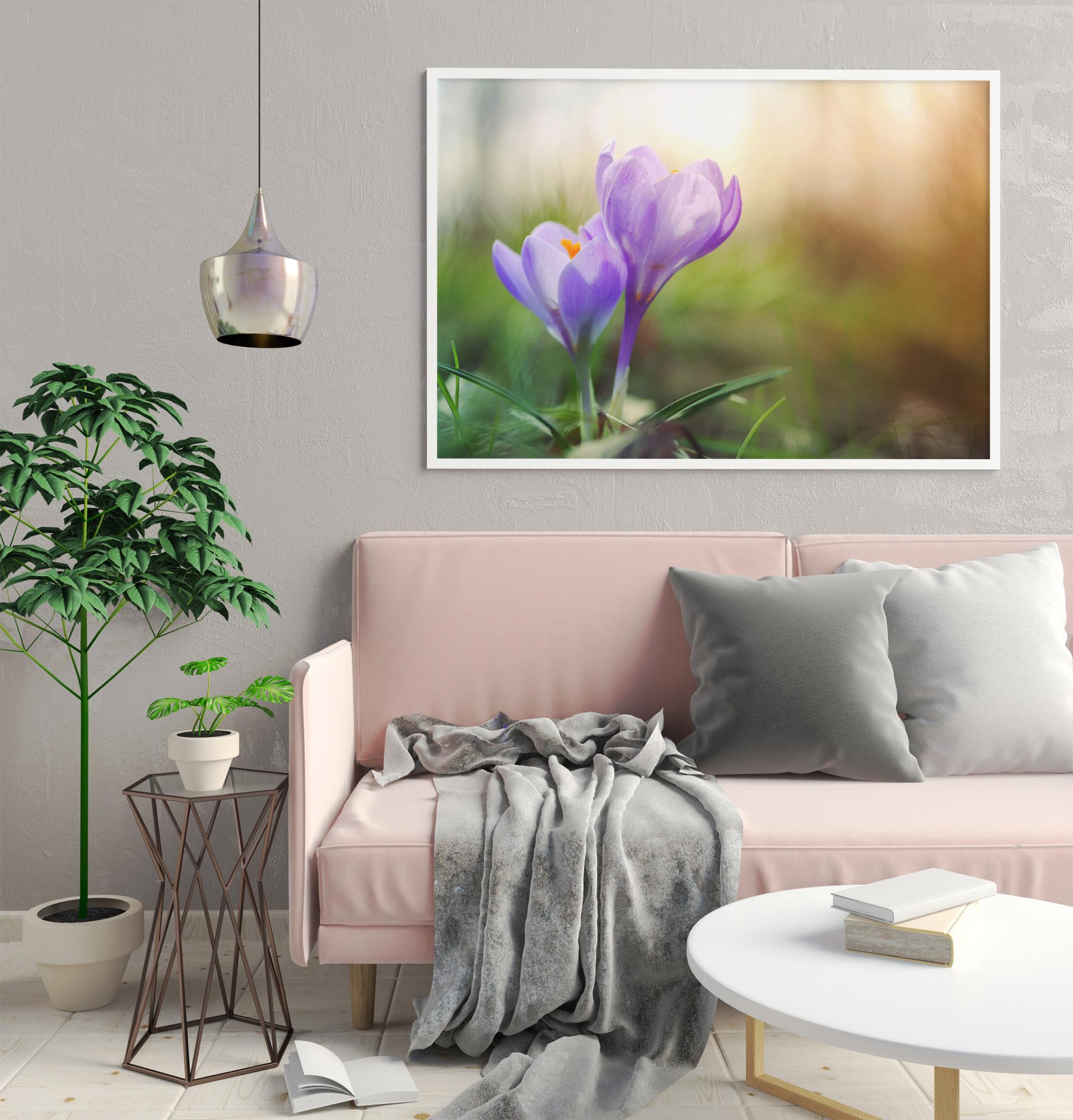 Čudovita slika morda najbolj barvitega pomladnega oboževalca sonca, žafrana. Zamegljeno ozadje v komplementarni barvi dvigne cvetove in fotografiji doda harmonijo. Primerna je za tiste, ki želijo v dom vnesti barvno veselje, in vedno je lepo uporabiti odtenek iz slike kot poudarek v preostali opremi. Priporočamo, da jo kombinirate z drugimi rastlinskimi motivi za ustvarjanje celostnega vtisa v prostoru.