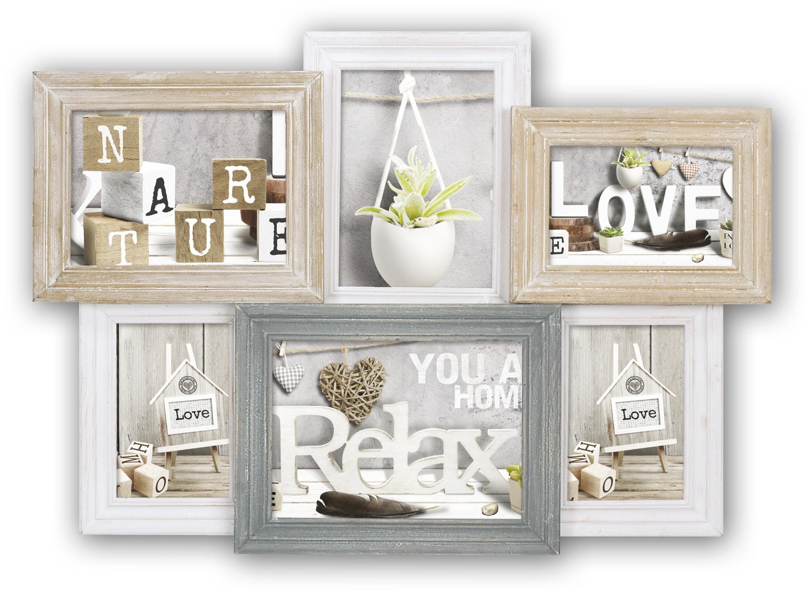 Naj ta očarljiv kolažni okvir vnese občutek bližine narave in sproščenosti v vaš dom! Okvir ima prostor za 6 slik različnih formatov. Letvice so v barvah lesa, sive in bele s starinskimi detajli.