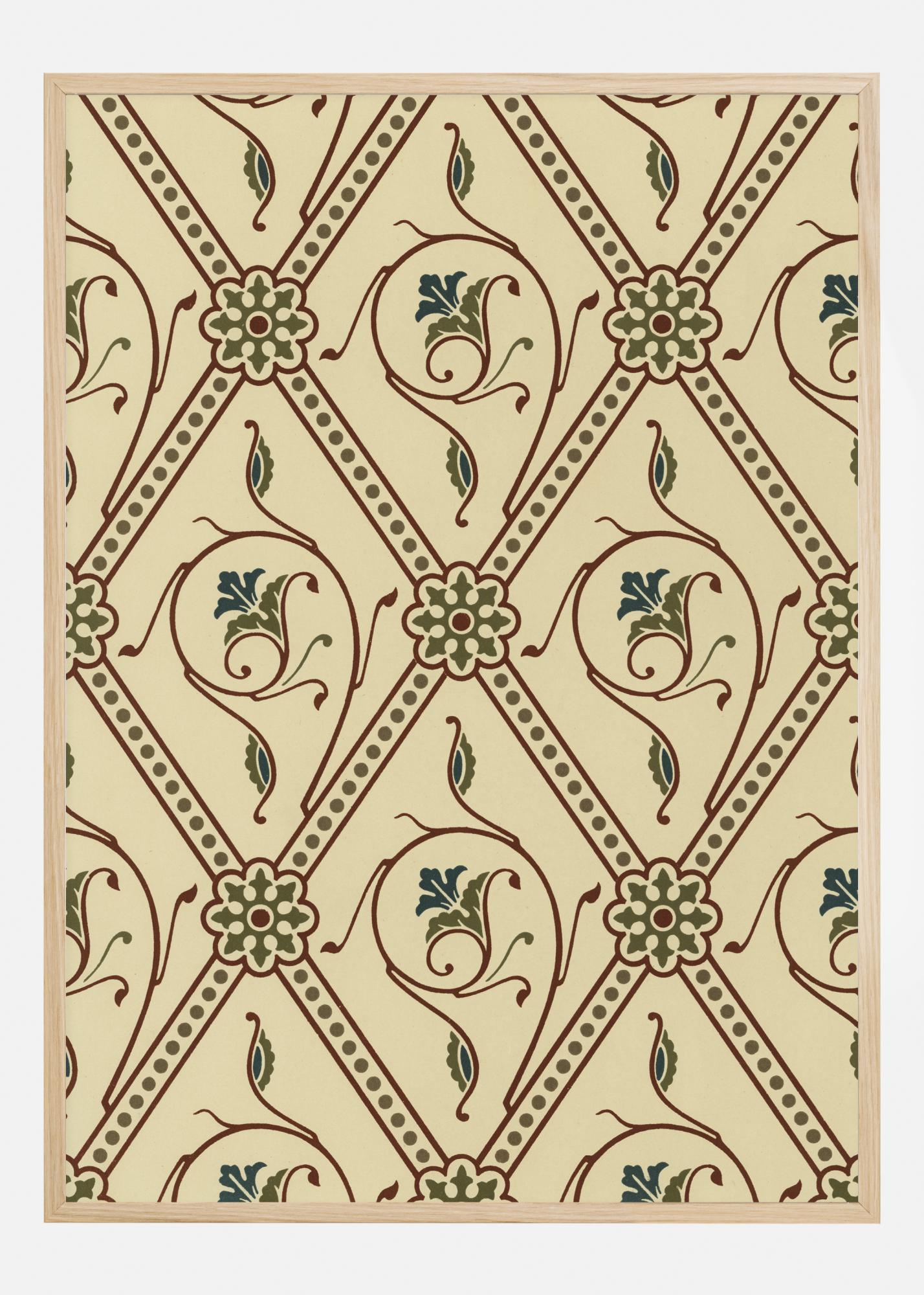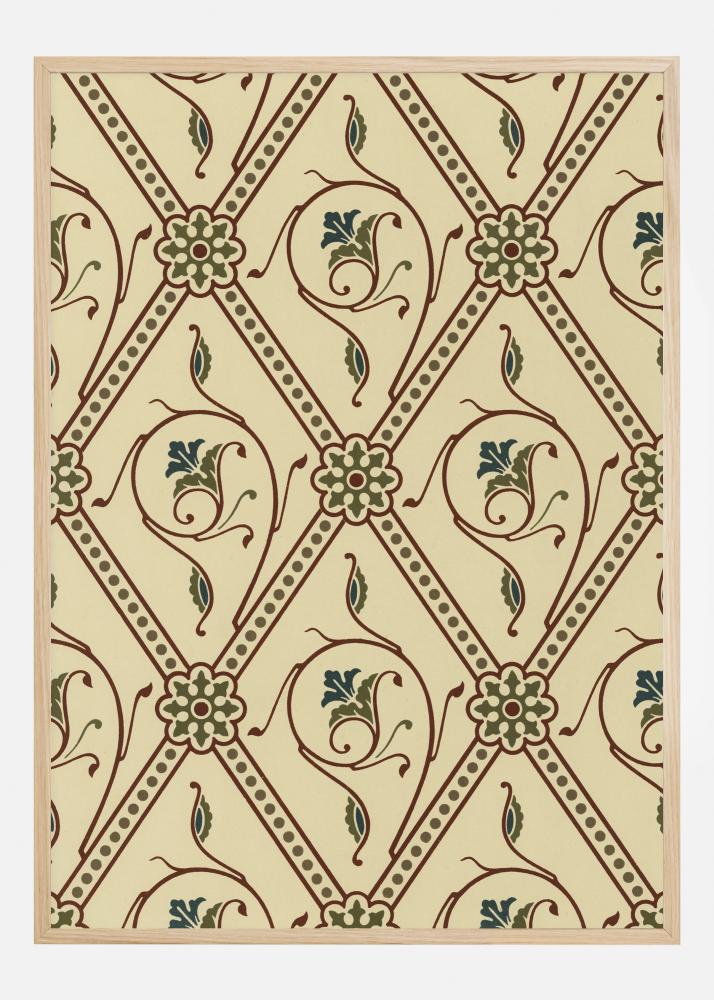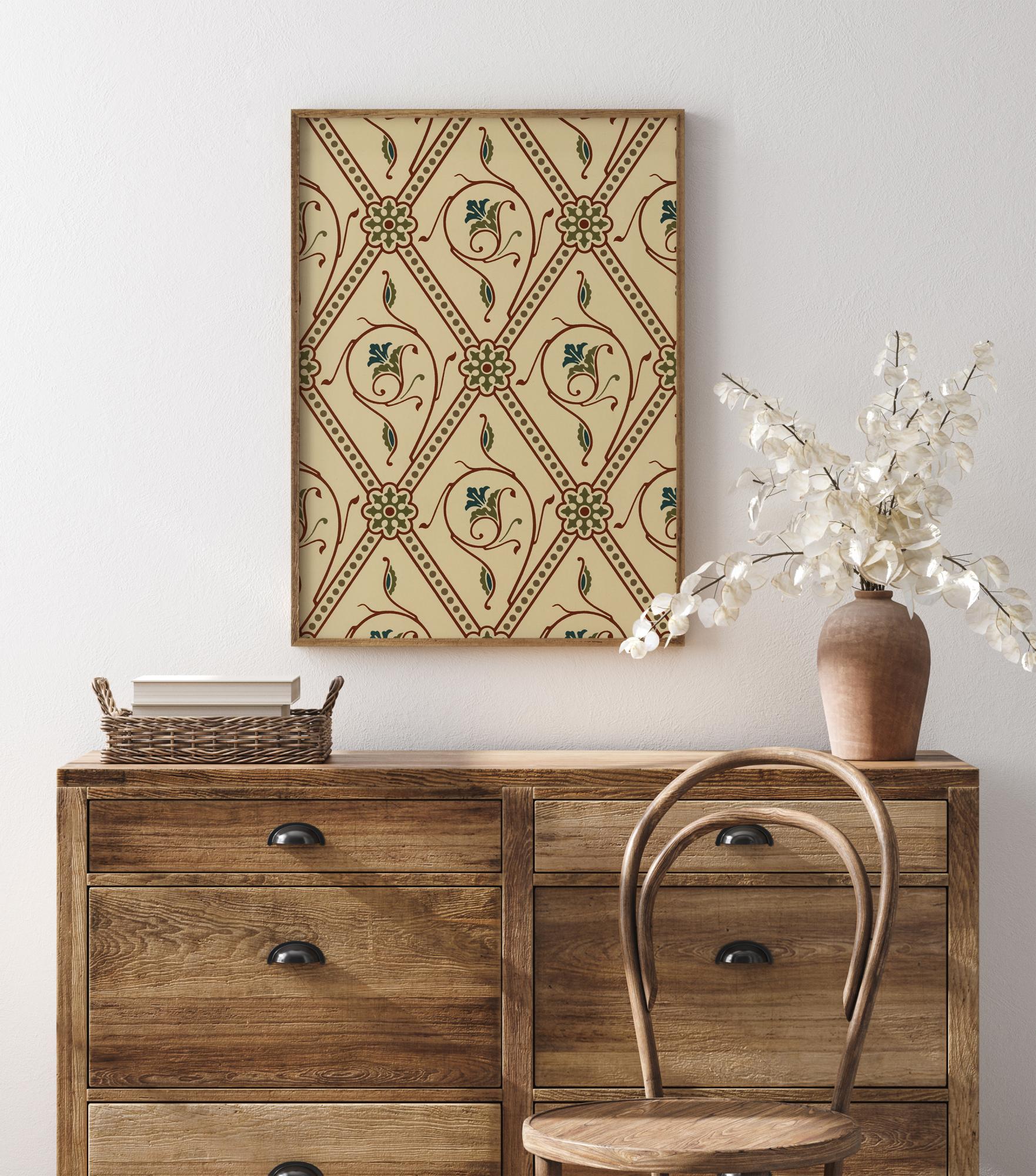 Tapetni poster s kremastimi, rdečimi in zelenimi vzorci. Veliki diamanti tvorijo glavne meje v vzorcu. Znotraj vsakega od njih je vrsta zavitih rdečih linij, ki se zaključujejo v zelenih in modrih oblikah listov in cvetov. Vzorec je eleganten in tekoč, popoln način za popestritev gladke stene z nečim malce drugačnim.