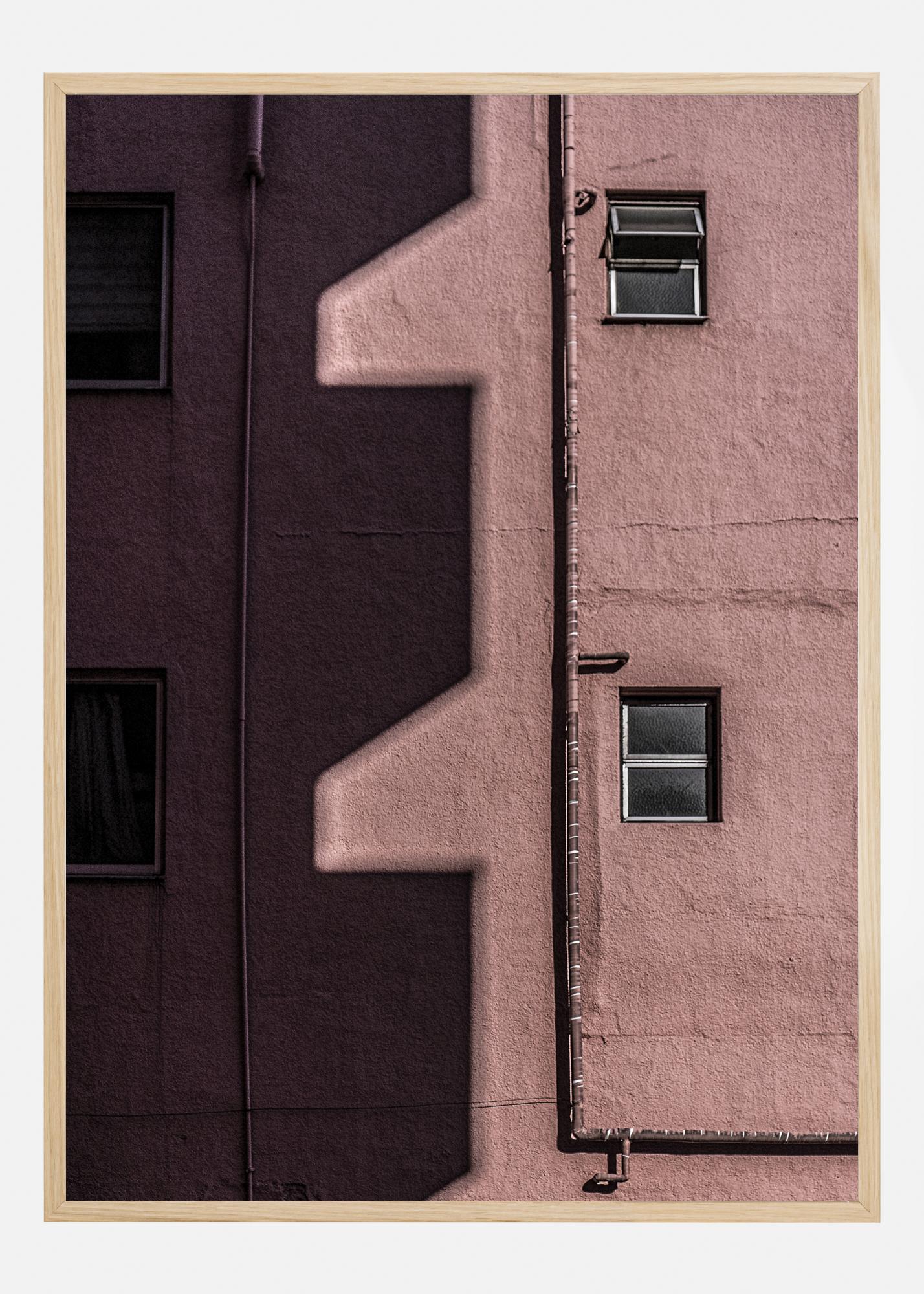 Plakat stavbe z zunanjostjo temno rožnate stavbe. Sence in svetloba mečejo nenavadne oblike na stran stavbe. Okna izgledajo kot oči, ki so poravnana s sencami, ki izgledajo kot nosovi, tako da ta podoba zdi, da strmi nazaj v vas.
