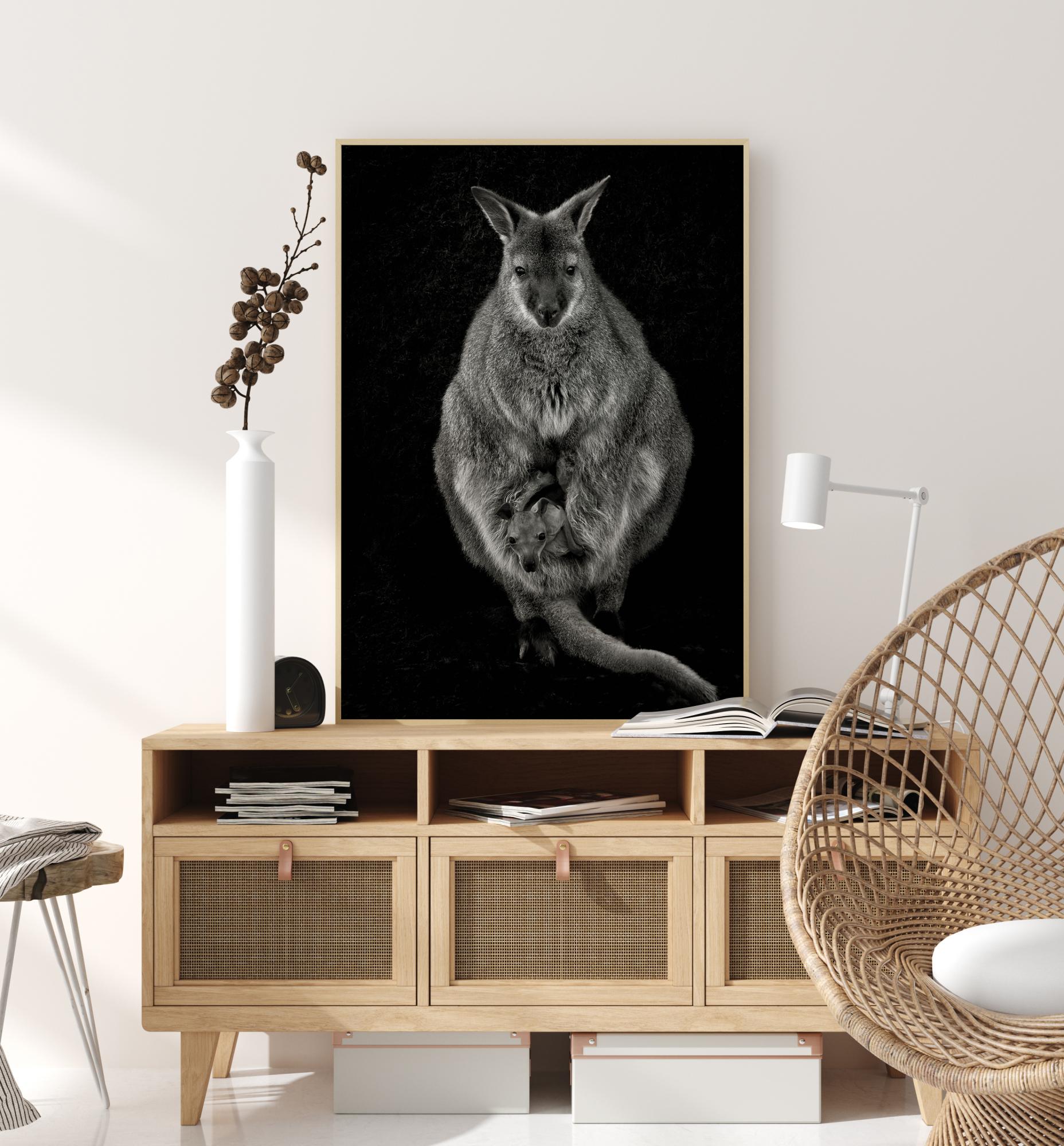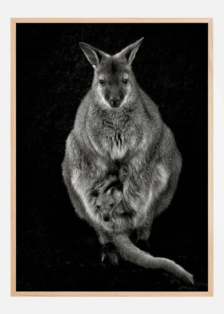 Naravni poster z wallabyjem in njenim otrokom. Par izstopa na osupljivi sliki proti črnemu ozadju. Pridobite tisti sladek, mehak občutek, ko gledate to mamo in njenega otroka.