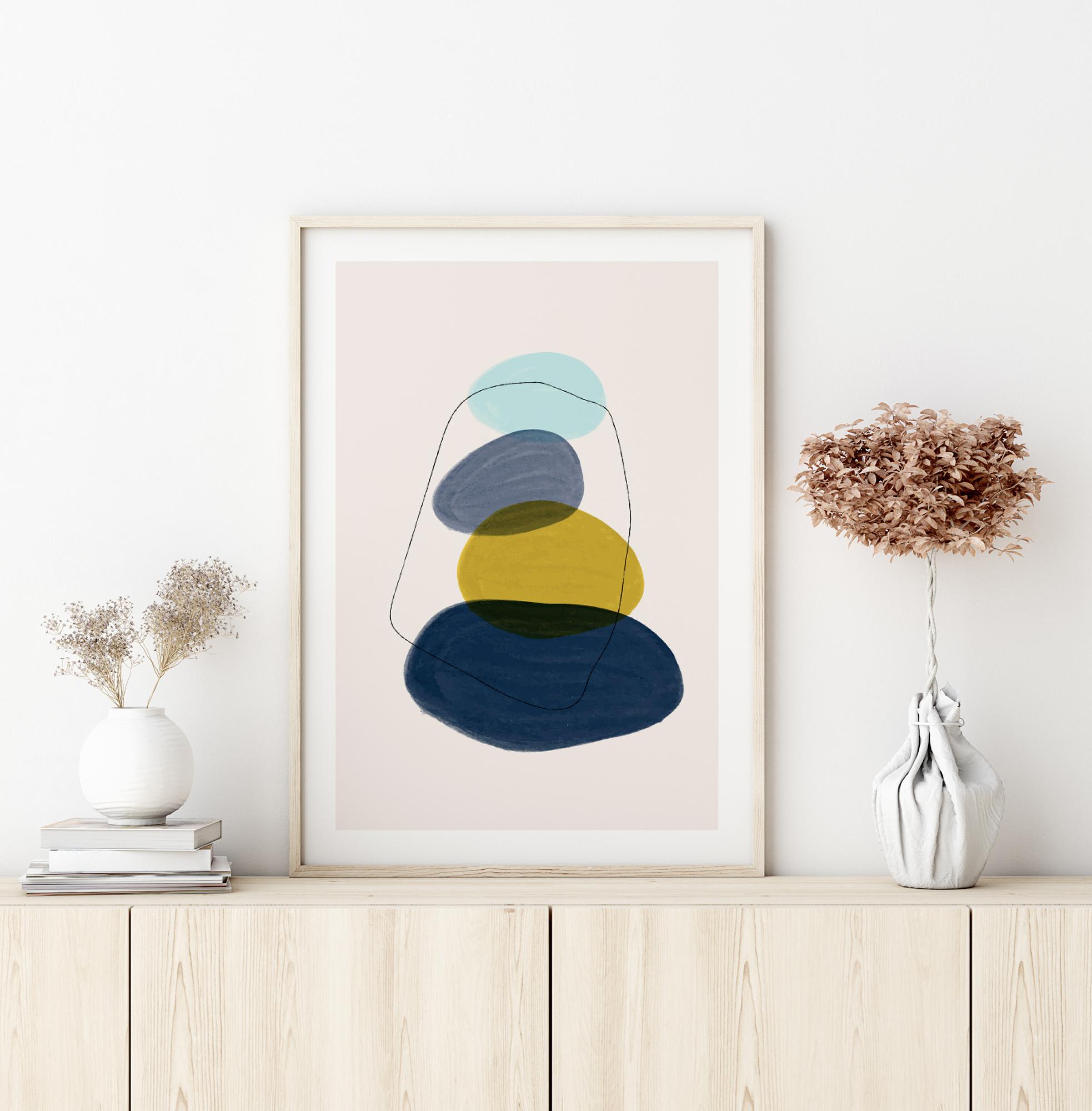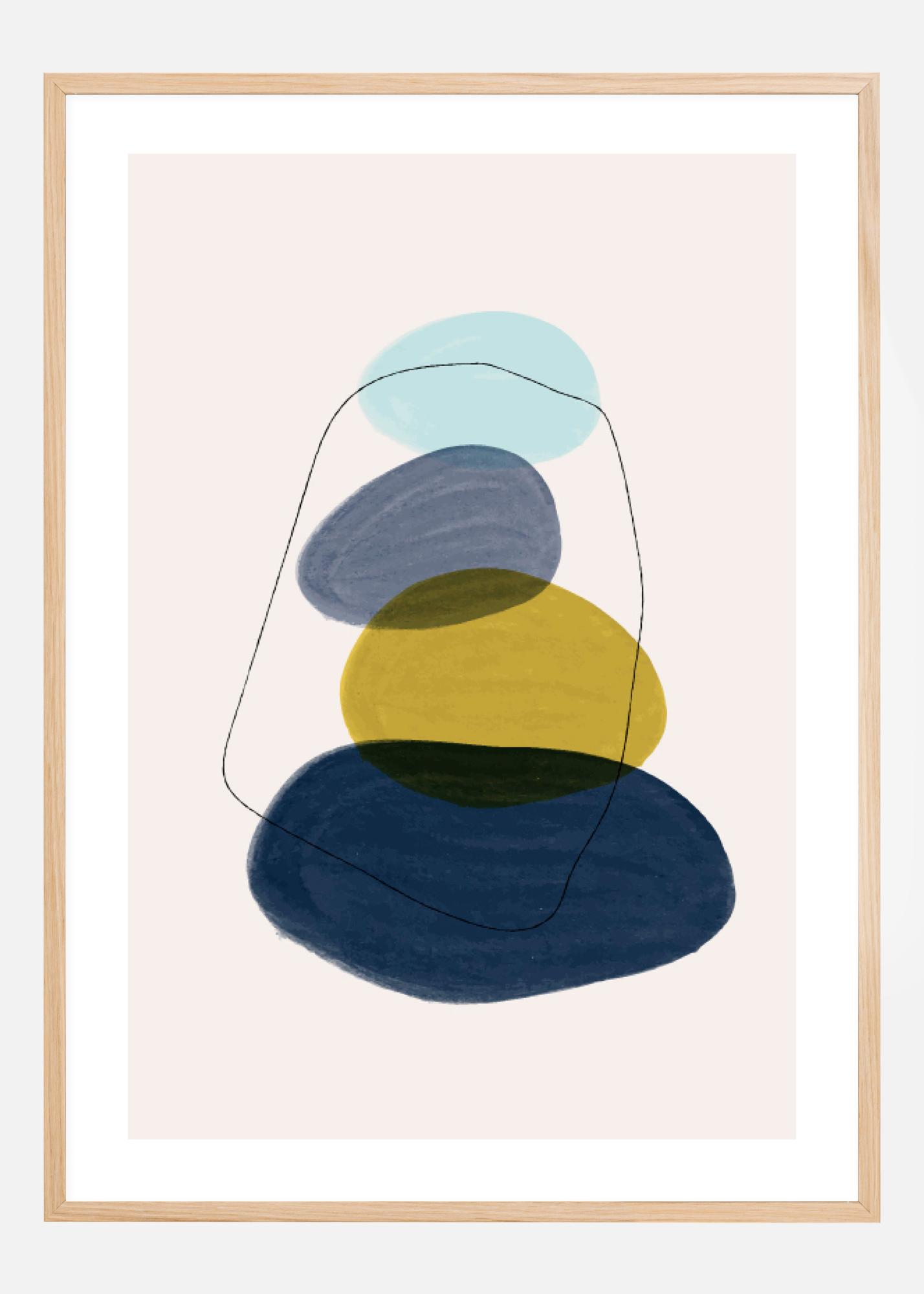 Zabaven abstrakten poster z različnimi okroglimi oblikami, ki izgledajo kot kamni. Oblike so na začetku velike in se postopoma manjšajo, ko so zložene ena na drugo v tej zabavni sliki. Temno modre, svetlo modre in rumene barve na tej sliki naredijo ta del svetel in poživljajoč za vaš dom.