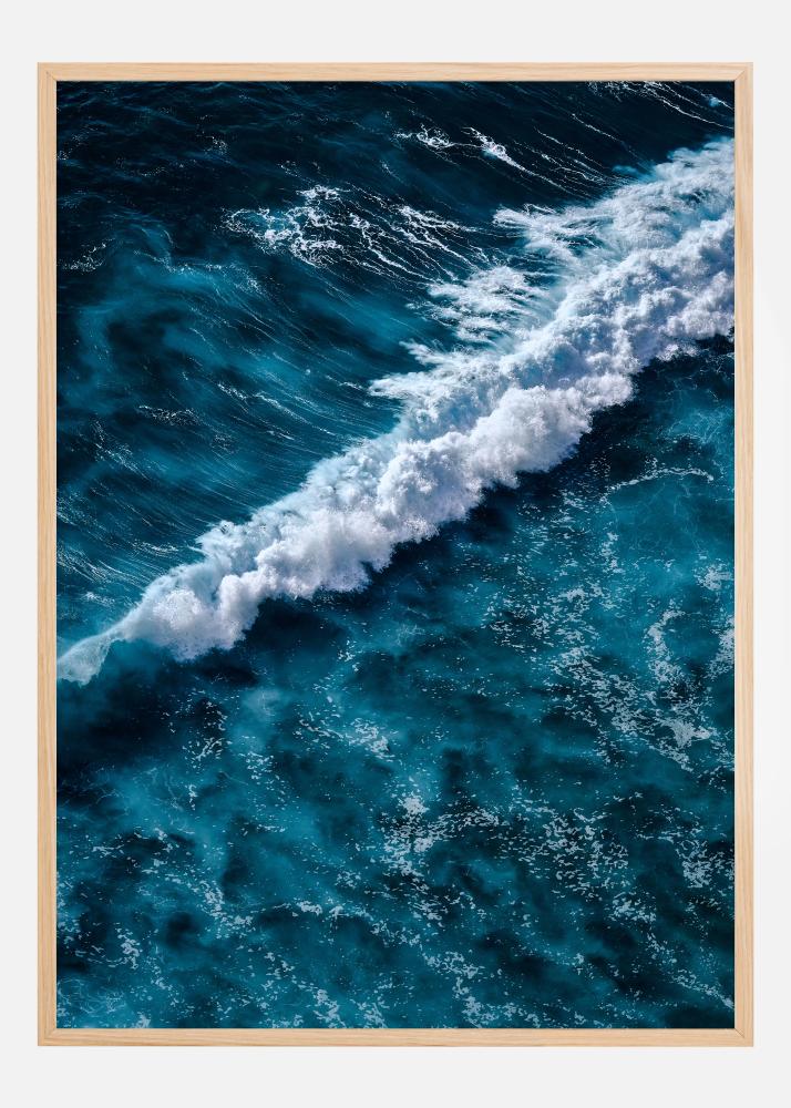 Ta dinamični poster ujame mogočno moč morja v trenutnem posnetku razbijajočega vala. Z odtenki globoko morsko modre in svetleče bele pene je kontrast ne le osupljiv, ampak tudi poln gibanja in življenja. Površina morja, živa in spreminjajoča, ujame pogled opazovalca in ga vodi skozi naravni ritem in ples vala.