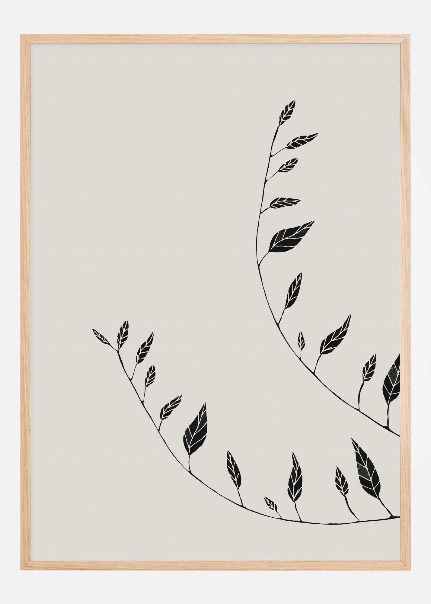 Črno-bela plakat z enostavnimi vejami in listi na beli podlagi. Dve veji vstopata z desne strani in se upogneta navzgor proti vrhu plakata. Listi so vsi obrnjeni navzgor na eni strani vsake veje. Ukrivljenost daje občutek, da rastlina raste, ko se steguje navzgor proti nevidnemu soncu.
