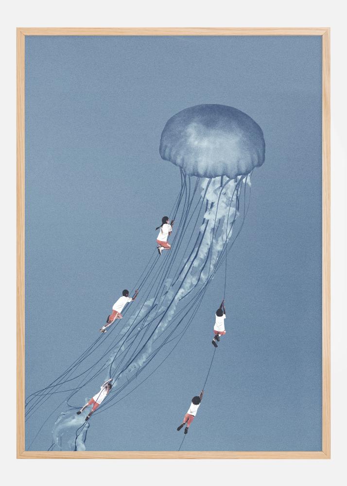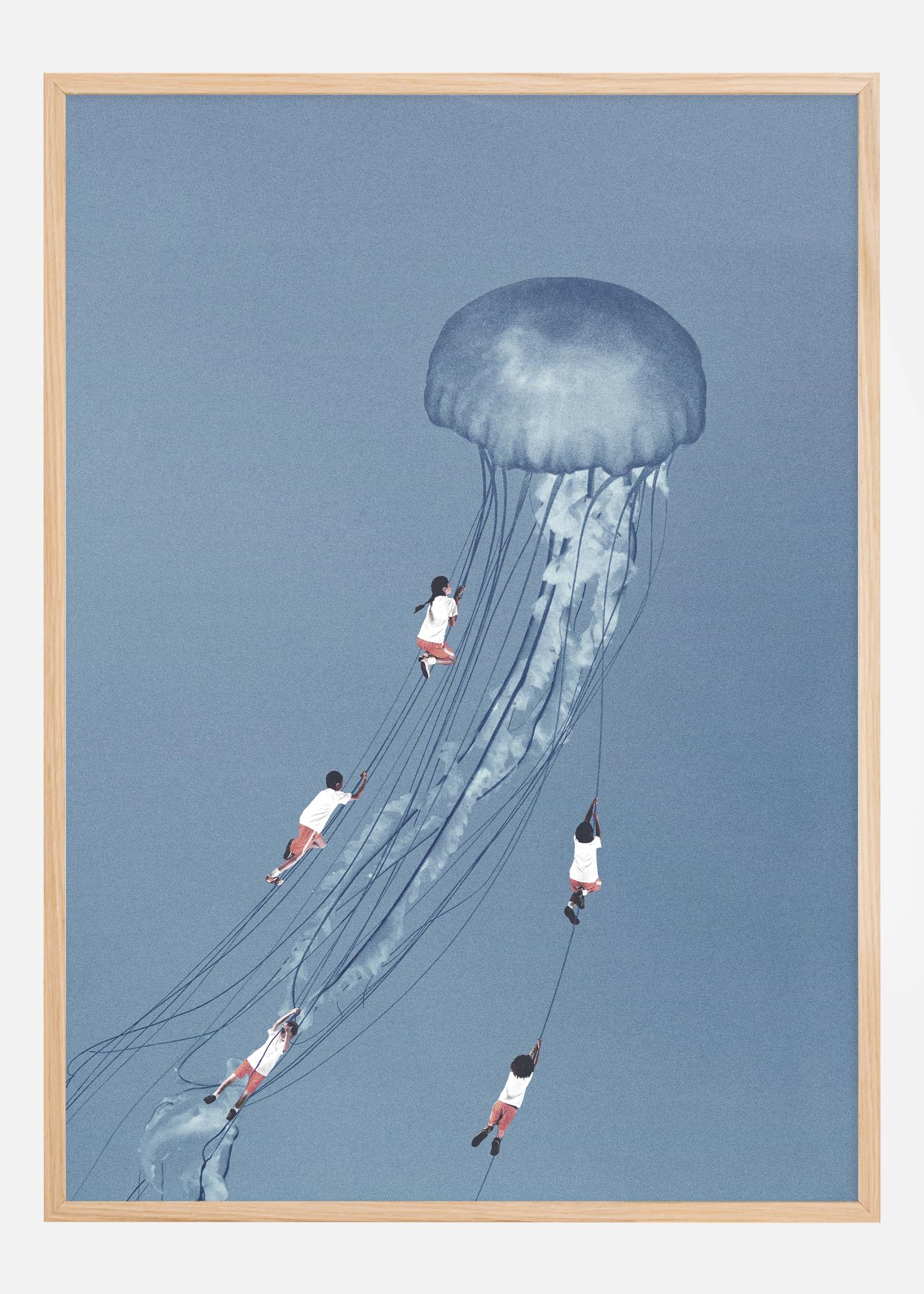Ta poetična in sanjava plakat prikazuje ljudi, ki se gugajo na lovkah velikanske meduze, lebdeče v neskončnem modrem nebu. Ta fascinantna scena je poklon moči domišljije, kjer podzavest in sanjski svet trčita z budno resničnostjo. Breztežni ples oseb z meduzo simbolizira veselje, svobodo in neobremenjeno lahkotnost, ki je pogosto prisotna v igrivih svetovih otrok.