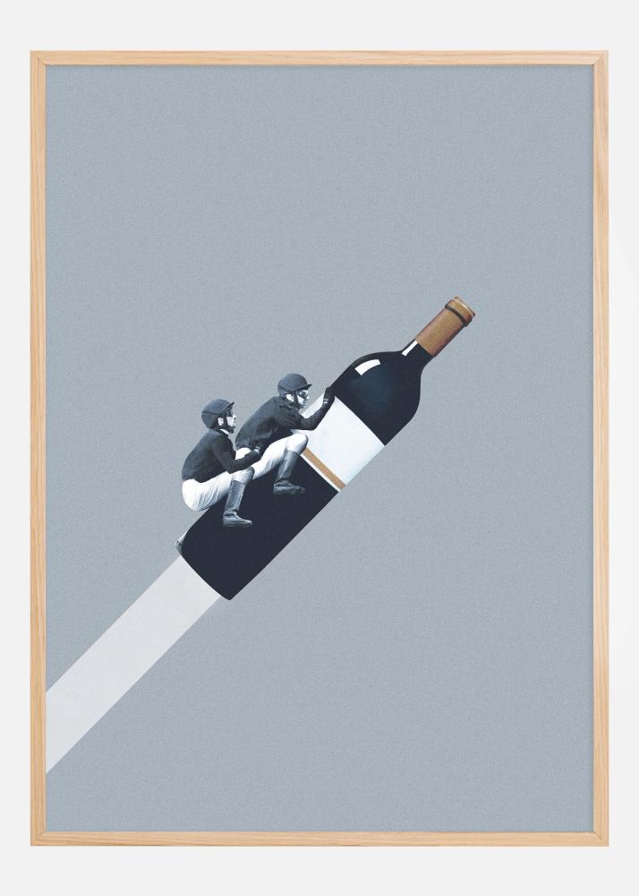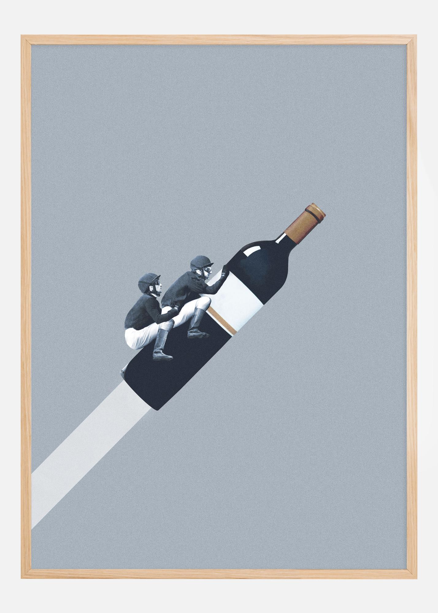 Barvna shema je umirjena a izrazna, kjer hladni modri odtenki v ozadju dopolnjujejo temnejše tone jahalnih oblačil in globoko črnino steklenice vina. Združuje moderno estetiko z občutkom nostalgije, zaradi česar je ta plakat popoln umetniški dodatek v domovih, ki cenijo mešanico tradicije in humorja. To je sodobna interpretacija jahanja skozi nevihto, kar prinaša stilski in hkrati humoristični element v kateri koli prostor.