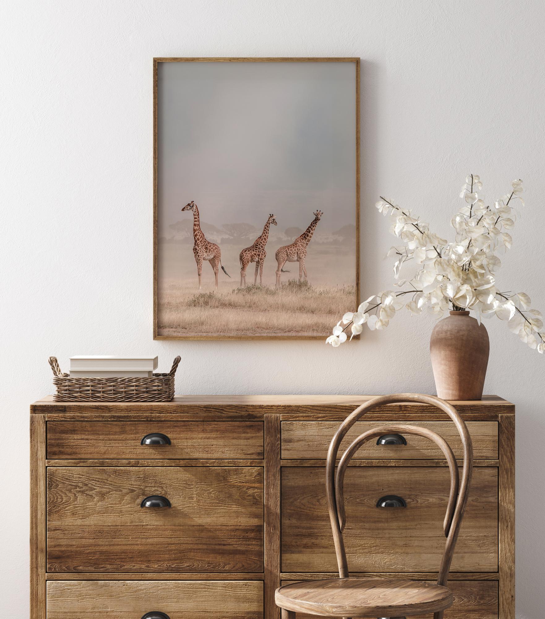Lep izraz divjine s tremi žirafami na afriški savani. Žirafe gledajo v različne smeri, medtem ko se borijo proti prašnim vetrovom iz Ambosele, ki se vrtinčijo v spirale in ustvarjajo meglast učinek. Obiščite Afriko, ne da bi zapustili hišo, s tem čustvenim posterjem.