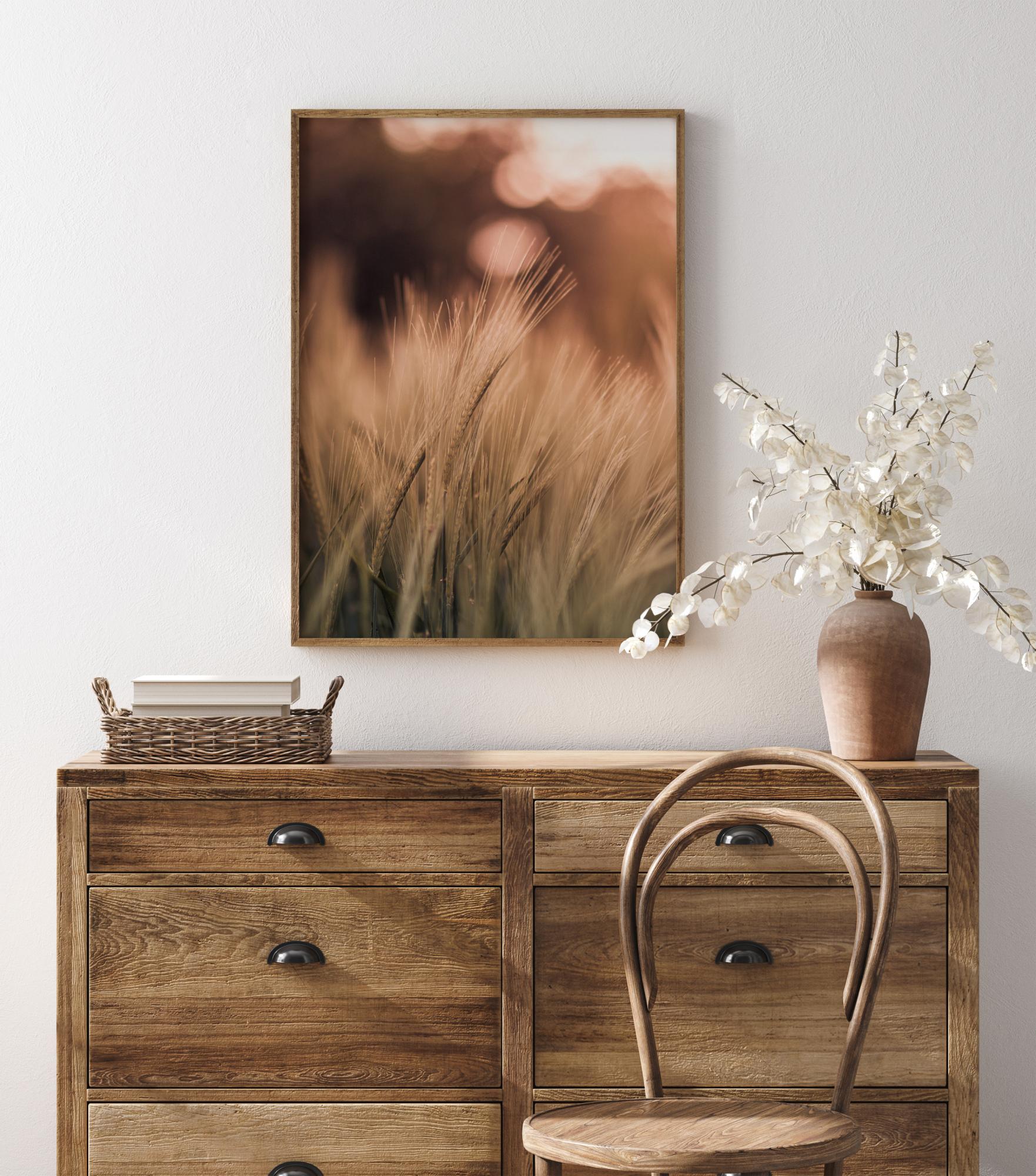 Mehka poster z vejami pšenice v pozno popoldanskem soncu. Mehka rožnata svetloba se pojavi v zlatih vretenih pšenice in ustvarja mehko, skoraj čarobno podobo. Spremenite vsakdanje v nekaj lepega, ko obesite ta tisk na mehko nevtralno steno, da ustvarite miren občutek.