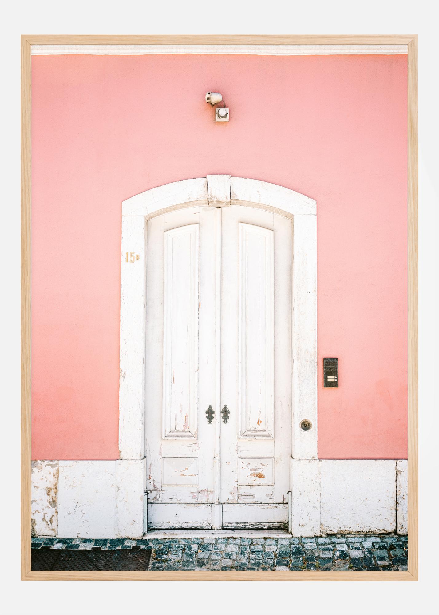 Ta plakat prikazuje čudovito sliko belih vrat na mehki rožnati steni, pogled, ki diha sproščen in vendar eleganten slog, ki je tako značilen za Lizbono. Bela pobarvana površina vrat, ki kaže znake patine in starosti, daje občutek zgodovine in značaja, medtem ko črne železne podrobnosti dajejo klasičen pridih. Hišna številka "15" je diskretno nameščena na levi strani vrat, kamnita tlakovano pločnik pa poudarja čar evropske mestne podobe.