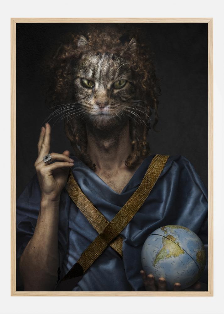 Ta edinstveni plakat prikazuje nenavadno in miselno izzivalno sliko, kjer je glava mačke nameščena na človeško postavo. Motiv prikazuje globoko, temno ozadje, ki močno kontrastira s svetlim, ostrim pogledom figure. Človeški del figure je oblečen v bogato modro tuniko, obrobljeno z zlatimi detajli, ki dajejo občutek elegance in moči. Figura drži v roki starinski globus, kar dodaja dimenzijo modrosti in svetovnega vpogleda. V sliki prevladujejo barve, kot so temnomodra, zlata, ter odtenki rjave in bež, ki se združujejo in ustvarjajo poster, ki je hkrati skrivnosten in ikoničen.