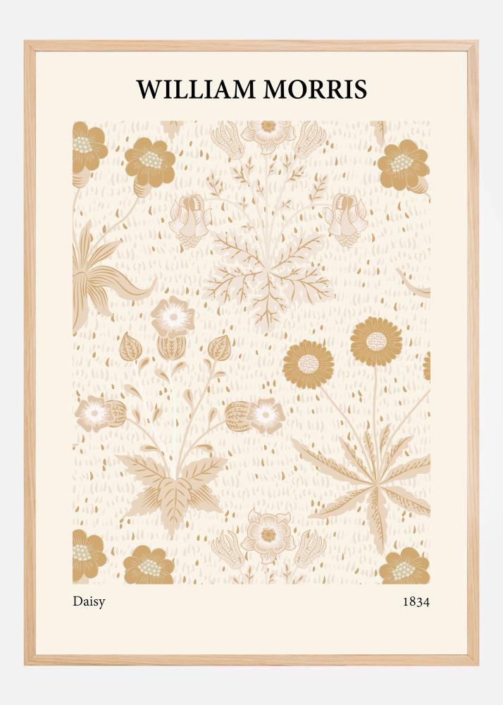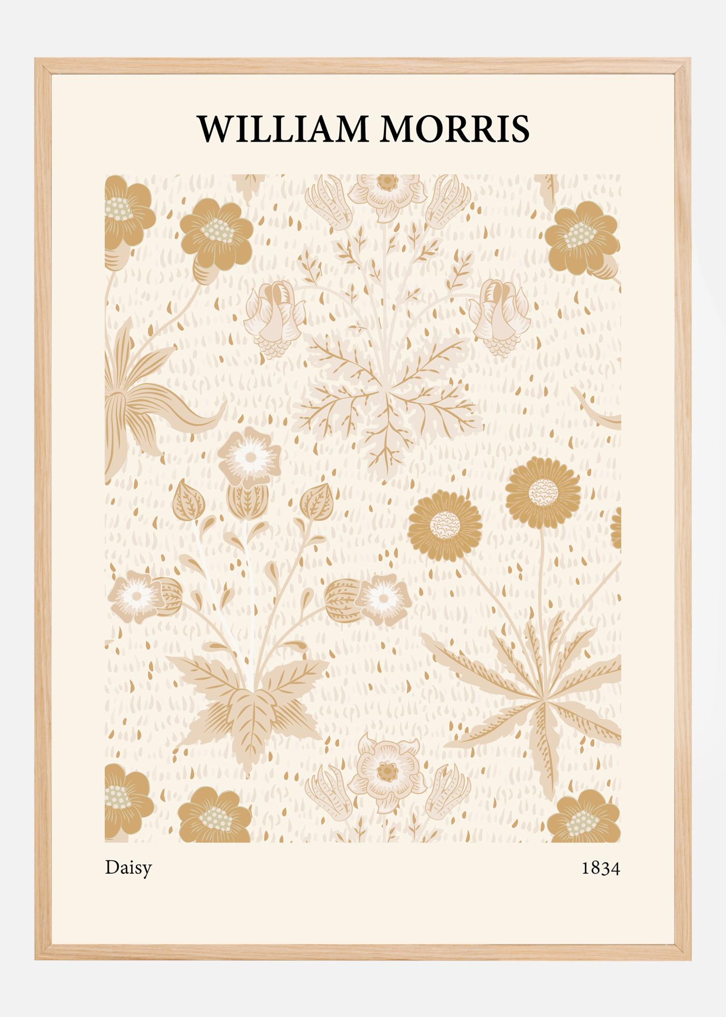 Ta občutljiv in eleganten plakat prikazuje klasičen dizajn Williama Morrisa, znan po svoji brezčasni estetiki in mestu v umetnostni zgodovini. Vzorec sestavlja harmonična zbirka cvetlic in rastlinja, predstavljena v mehki in naravni barvni paleti. Dizajn poudarja Morrisovo ljubezen do narave z detajlnimi upodobitvami marjetic (praproti), spominčic in drugih botaničnih elementov, katerih razporeditev na papirju ustvarja miren in uravnotežen vtis. Barve, ki prevladujejo v motivu, so odtenki bež, kremno bele in različnih rjavih tonov, ki skupaj dajejo topel in prijeten vtis vsakemu prostoru.