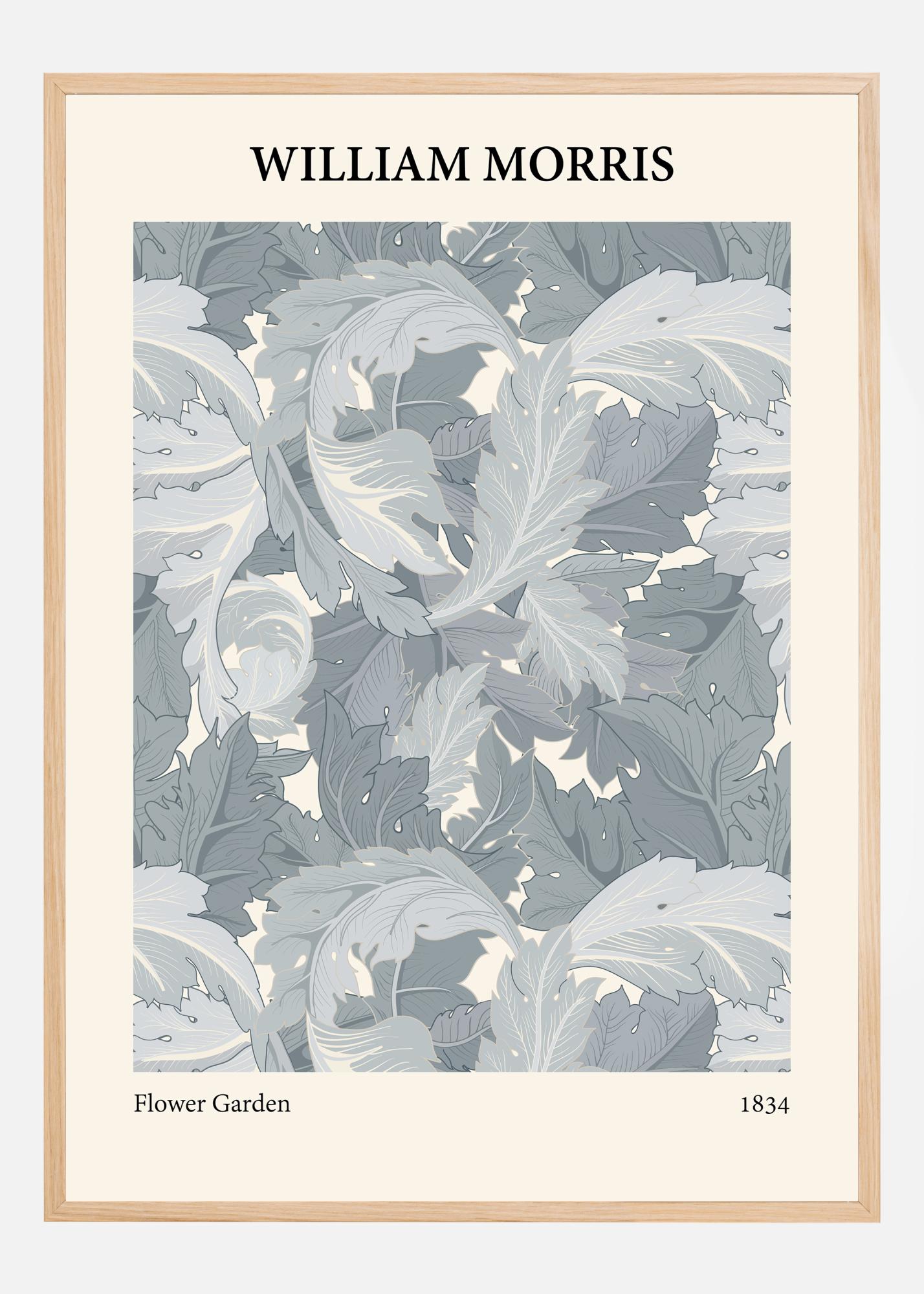 Ta poster z njegovim bujnim in sofisticiranim motivom Williama Morrisa ponuja občutek miru in klasične elegance. Dizajn je oda obilni zelenici, ki je pogosto povezana z Morrisom in njegovim delom v gibanju Arts and Crafts. Motiv, imenovan "Flower Garden", vsebuje strnjeno kompozicijo listov in cvetov, predstavljenih v hladnih tonih modre in sive z odtenki kremne bele. Vsaka podrobnost na tem plakat je skrbno premišljena, kar ustvarja občutek čednega in urejenega vrta.