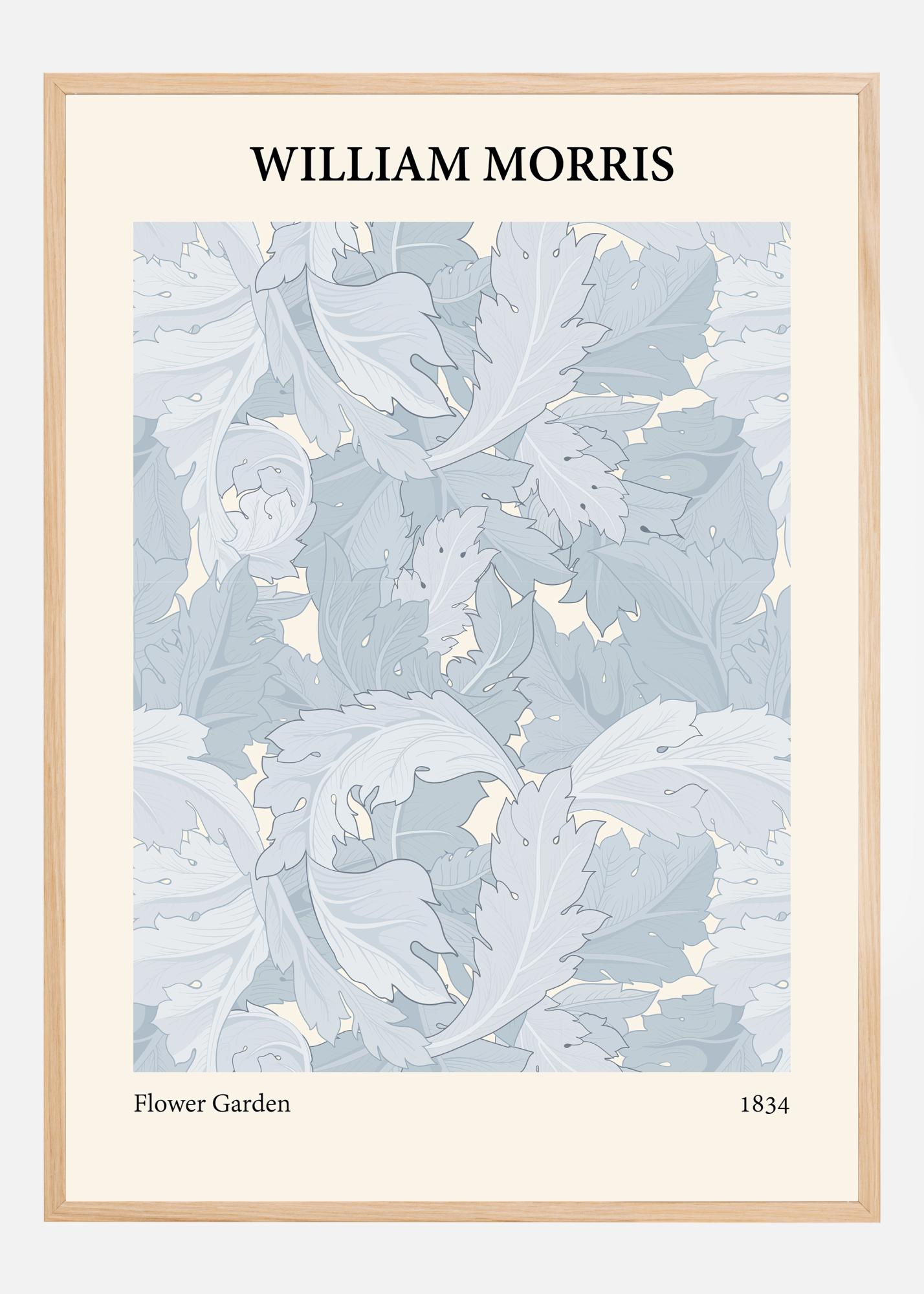 Z vzdušjem miru in elegance ta plakat Williama Morrisa predstavlja simfonijo prefinjenega listja v hladni in pomirjujoči barvni lestvici. "Cvetlični vrt", kot nakazuje naslov, ujame bistvo bujnega in tihega vrta s svojim podrobnim vzorcem listov, ki teče po površini z mehkim ritmom. Barvna paleta je skrbno izbrana, da odraža subtilno lepoto narave in vključuje nebeško modro, listnato zeleno in bledo kremne barve, ki skupaj ustvarjajo harmonično in uravnoteženo estetiko.