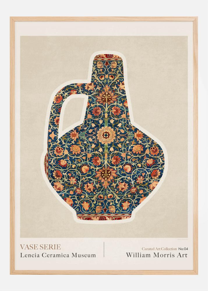 Ta plakat, ki je številka 04 v "Curated Art Collection" iz Lencia Ceramica Museum, je bogat in kompleksen poklon Williamu Morrisu in njegovemu pomembnemu prispevku k oblikovanju vzorcev. Predstavljena je elegantna vaza, pokrita s podrobnim in barvitim vzorcem, ki izžareva viktorijansko obdobje fascinacije za orientalsko in srednjeveško umetnost, slog, ki ga je Morris pomagal popularizirati.
