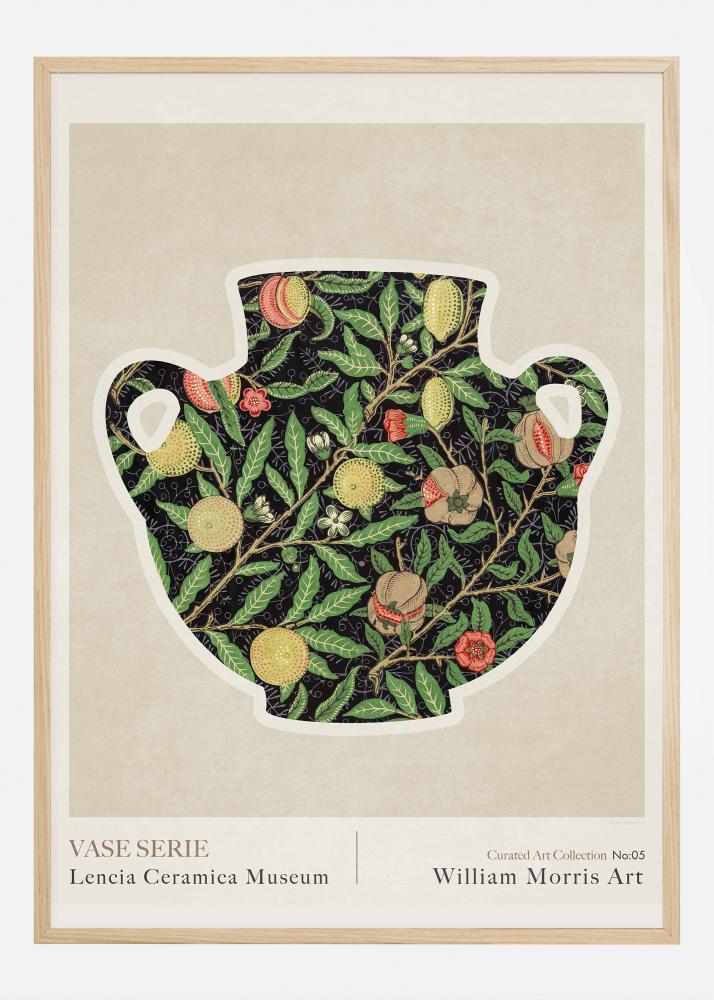 Na tem posterju, številka 05 iz "Curated Art Collection" v Lencia Ceramica Museum, doživljamo brezčasen vpliv Williama Morrisa na umetnost in oblikovanje. Predstavljeno delo je stilizirana vaza z zapletenim vzorčastim dizajnom, ki je napolnjena z očarljivo mešanico botaničnih elementov in motivov sadja, kar odraža Morrisovo strast do narave in njegovo sposobnost povezovanja naravnih oblik v svojem delu.