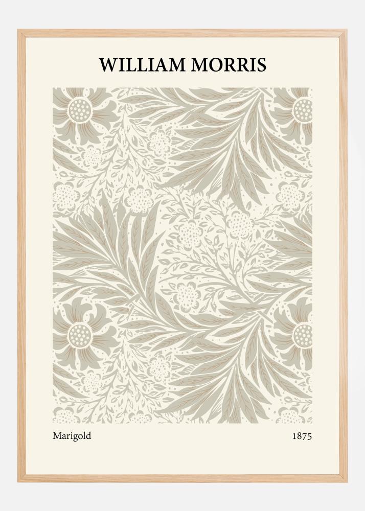 Ta plakat prikazuje brezčasni vzorec "Marigold" Williama Morrisa iz leta 1875. Je privlačna predstavitev Morrisovega spretnega uporabe oblike in elementov, navdihnjenih z naravo, ki se prepletajo v harmoničen vzorec. Dizajn plakata je odličen primer filozofije gibanja Arts and Crafts, kjer se lepota obrti in naravnega sveta povzdigne v umetniško obliko.