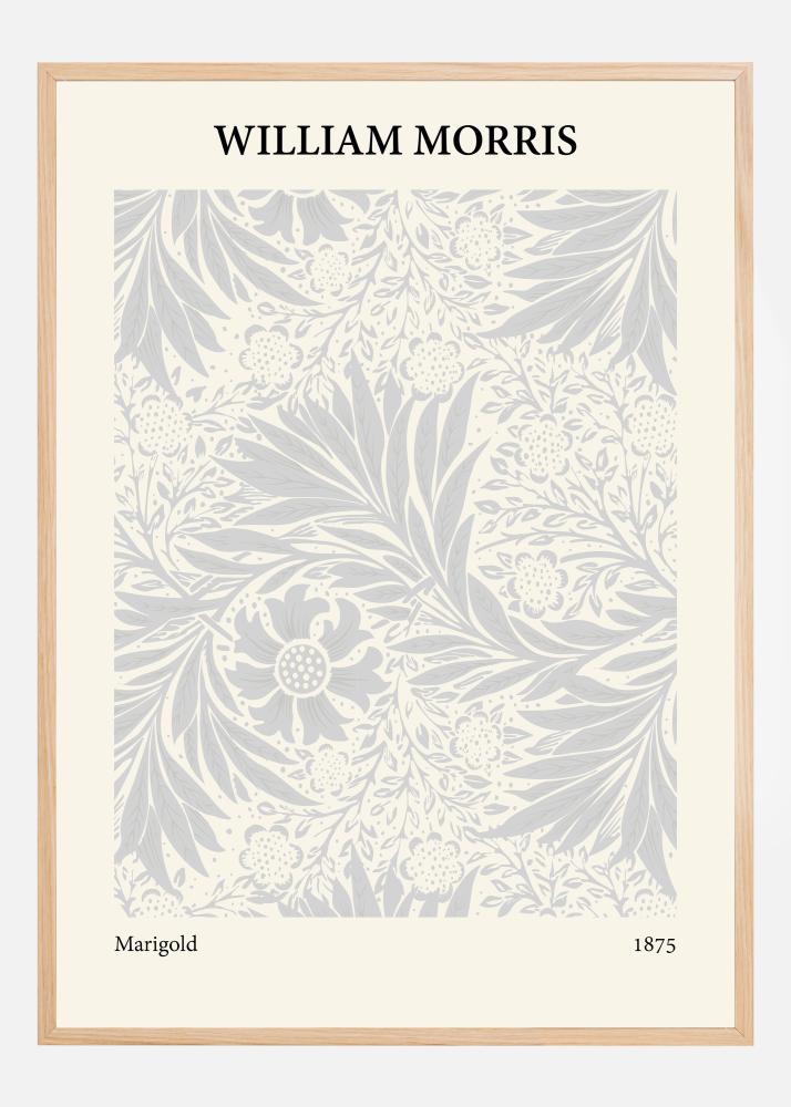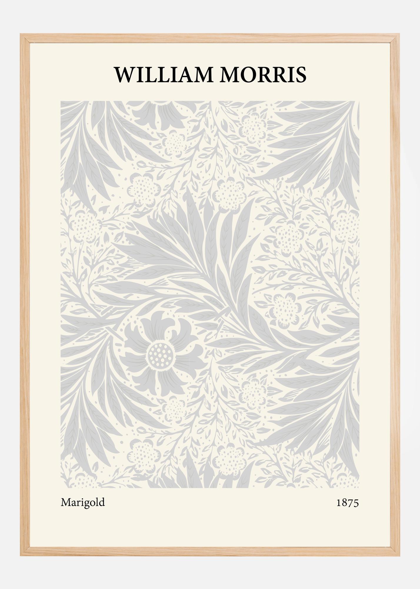 Ta plakat je eleganten prikaz Williama Morrisa "Marigold" iz leta 1875, ki vzbuja občutek miru in naravne lepote. Oblikovanje je polno cvetočih žametnic in občutljivega listja, ki so skrbno razporejeni v simetričen in privlačen vzorec. Subtilna barvna kombinacija bledih sivih in belih odtenkov ustvarja mehko in vabljivo estetiko, značilno za Morrisovo delo.