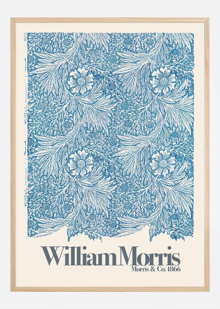 Ta plakat prikazuje klasičen vzorec Williama Morrisa z imenom "Marigold", ki ga je ustvaril Morris & Co. okoli leta 1866. Ikoničen vzorec, znan po svojih zapletenih in z naravo navdihnjenih elementih, je izdelan v temno modri barvi na čisti, kremni podlagi. Vsaka podrobnost v cvetlični aranžmaji je skrbno izklesana, kar prikazuje Morrisovo občutek za lepoto v naravi in sposobnost, da jo preoblikuje v umetnine, ki so brezčasne in ljubljene še danes.