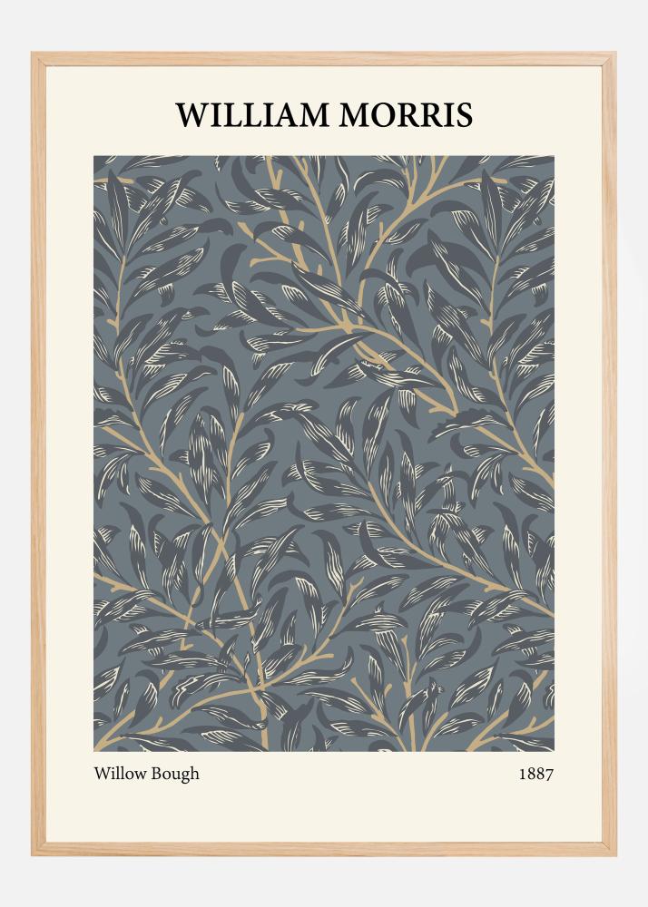 To je osupljiv plakat, ki poudarja klasični "Willow Bough" vzorec Williama Morrisa iz leta 1887. Spretno izdelani elegantni vrbovi listi so v odtenkih modre in sive barve, ki so elegantno kontrastirani z linijami v toplem zlatem tonu. Ta kombinacija prinaša bogastvo in globino celotni zasnovi in je dokaz Morrisovega mojstrstva ter njegovega trajnega vpliva na oblikovanje vzorcev.