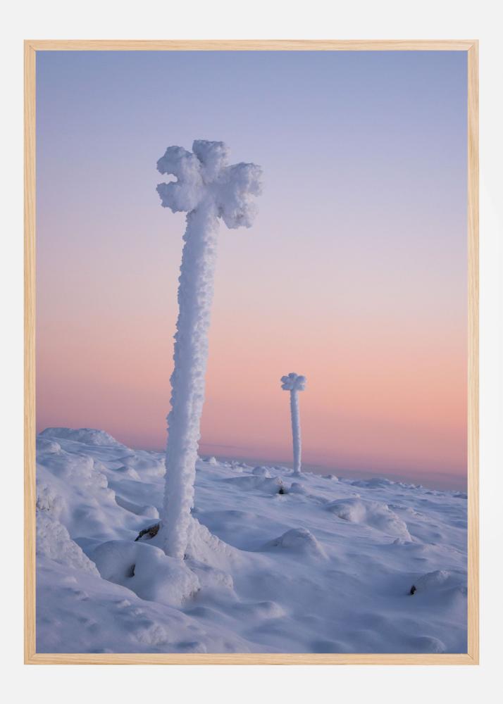 Ta poster prikazuje sanjsko zimsko pokrajino, kjer snežne formacije nežno izstopajo iz mehko valovitega snežnega polja. Motiv zaznamujeta mir in minimalizem, s stebri, prekritimi s slano, ki skoraj spominjajo na naravne skulpture. Nebo se ponaša z lepim prelivom barv, ki sliki daje umirjen in poetičen izraz – popolna izbira kot print ali plakat za vse, ki želite v dom vnesti harmoničen in sodoben občutek.