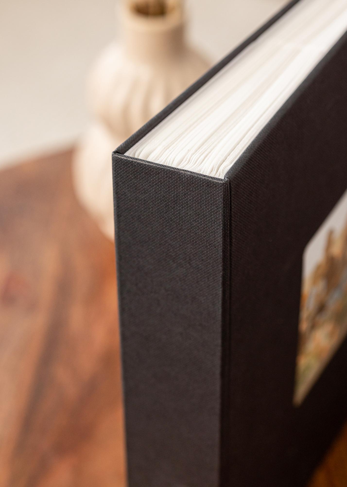 Platnice albuma so v klasični črni barvi, ki daje brezčasen in sofisticiran občutek. Bele strani v albumu ustvarjajo čudovit kontrast in poudarijo vaše slike na najboljši način. Usmerjenost slik v albumu je tako ležeča kot stoječa, kar vam daje prilagodljivost pri razporeditvi vaših fotografij točno tako, kot želite.