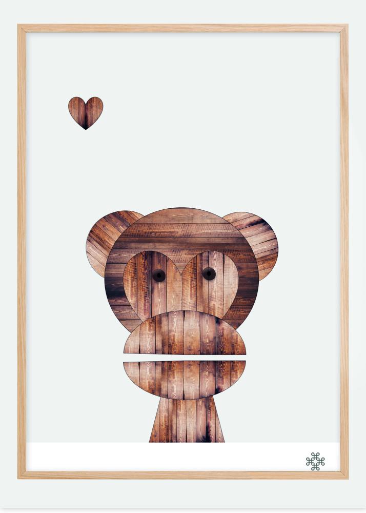 Plakat z lesenimi deskami, kjer les ustvarja obliko majhne opice. Nad opico je majhno srce. Opica te gleda s slike in ti daje vso ljubezen. Ta majhna ljubezenska opica je iznajdljiva in nenavadna ter je popolna izbira za okrasitev otroške spalnice.