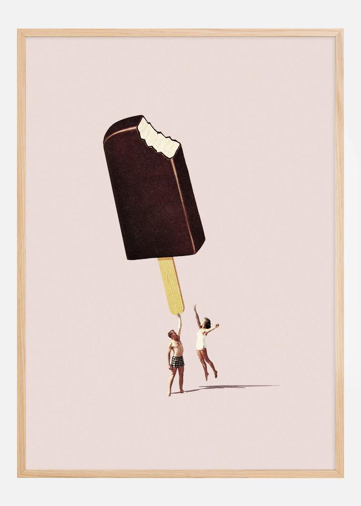 Ta očarljiv plakat prikazuje edinstveno in igrivo sliko dveh oseb, ki očitno najdeta velikansko lučko! S svojo domiselno kompozicijo in toplo pastelno roza ozadjem ta slika ponuja občutek poletne radosti in nostalgije. Vesela lika, oblečena v preprosta kopalna oblačila, segata po lučki, ki ima realističen videz z ugrizom, kar ustvarja čudovit kontrast z minimalističnim okoljem. Ta ustvarjalni in živahni prizor pritegne pozornost opazovalca in prebudi spomine na sončne dni.
