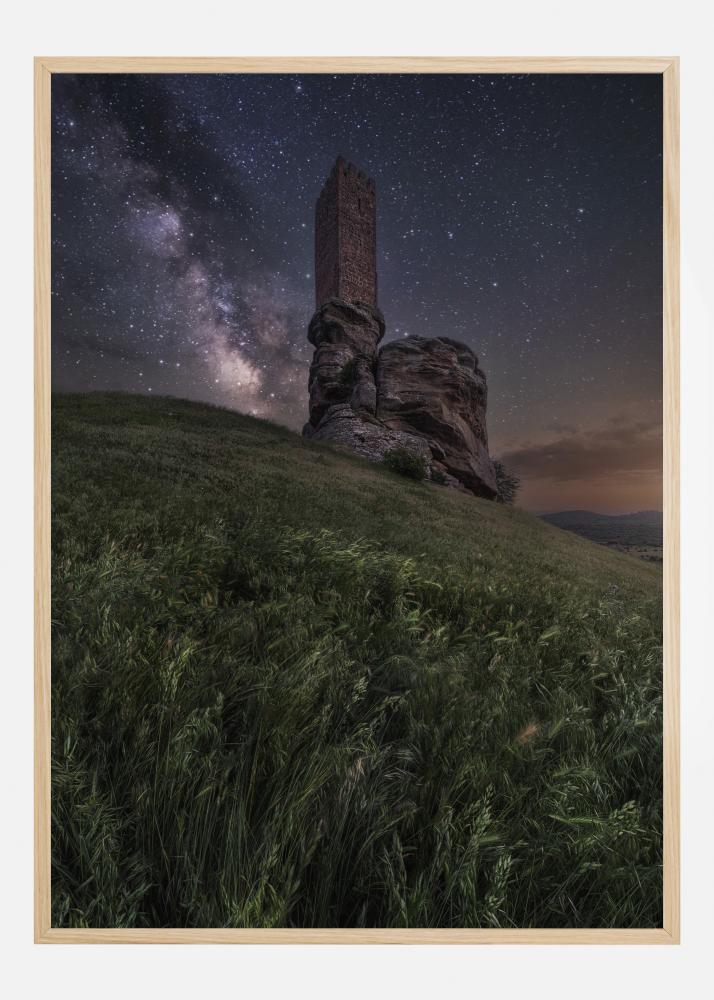Čudovit poster s gradom Zafra ponoči. Pogled navzgor proti tej starodavni kamniti konstrukciji z dna travnatega hriba. Stolp se dviga proti nočnemu nebu, kjer Rimska cesta oblikuje lok čez nebo. Ta lepa slika bo videti odlično na kateri koli steni v vašem domu in prinaša pridih čarobnega tudi.
