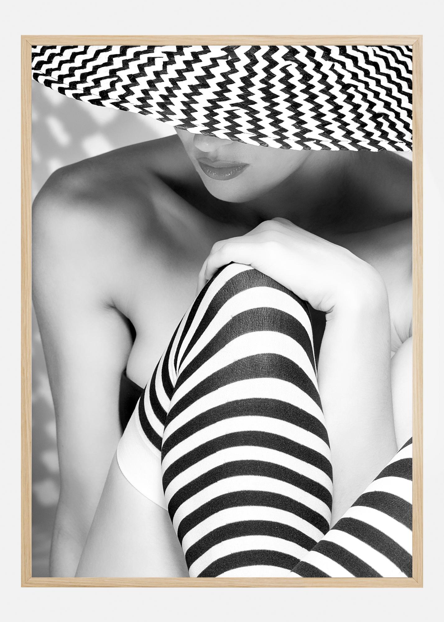 Geometrijski portret plakat ženske, ki nosi vzorčast klobuk in črtaste nogavice. Naslanja se naprej z roko na kolenu. Njen obraz je skrit z vzorcem klobuka na tej vpadljivi sliki. Združite to z dotikom barve na steni in si oglejte, kako vzorci eksplodirajo.