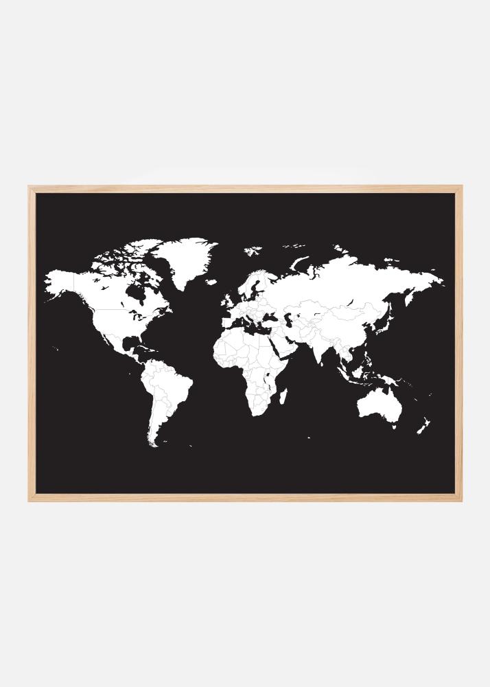 Zemljevid sveta - bel s črnim ozadjem Poster