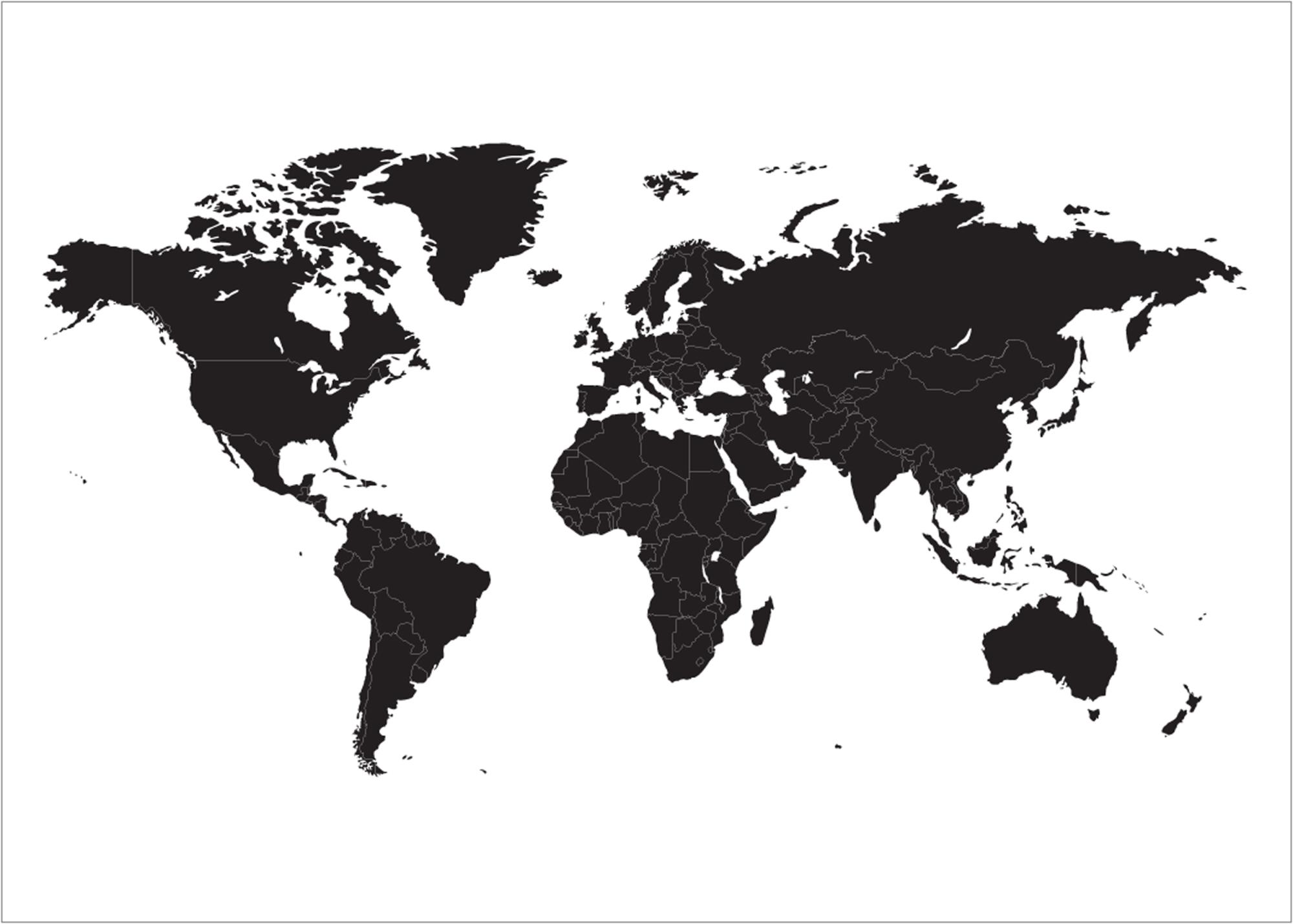 Eleganten črno-bel zemljevid sveta s celinami v črni barvi, kjer so države označene s tankimi belimi črtami. Grafični poster se enako lepo poda v sodobno minimalistično okolje kot v interierje s klasičnim pohištvom. Izberite čudovit okvir, ki se ujema s preostalim interierjem, da se slika prilega celoti, ali pa obrazujte zemljevid z okvirjem, ki resnično izpostavi motiv in ga poudari na steni.