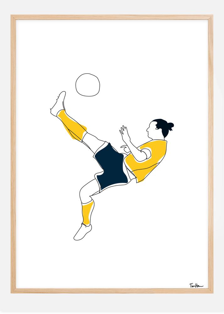 Plakat z nogometno tematiko s stilizirano podobo Zlatana Ibrahimovića, ki brca nogometno žogo. Igralec nosi rumeno majico in nogavice s temno modrimi kratkimi hlačami. Nagiba se nazaj in brca z nogo visoko v zraku, kjer leti nogometna žoga. Praznujte svojo ljubezen do nogometa s to preprosto, a učinkovito obliko.