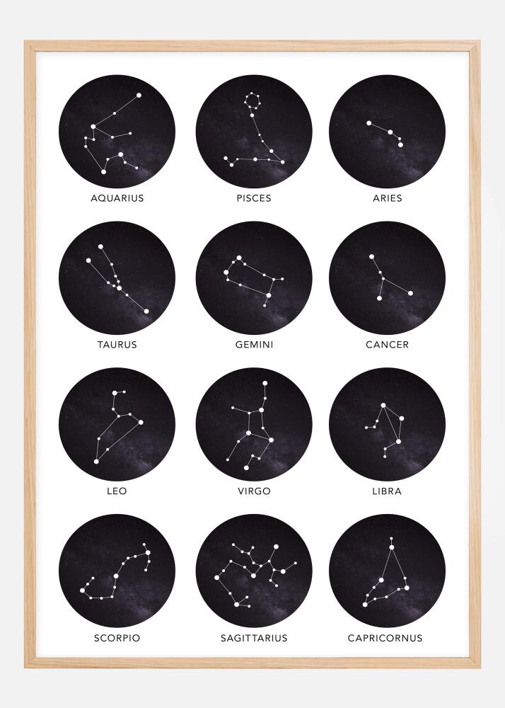 Podarite plakat z znamenjem zodiaka nekomu, ki ga imate radi, ali pa se razvajajte z nečim lepim. Ta stilni plakat ima motive vseh zodiakalnih znamenj in pod motivi so imena znamenj v angleščini. Ne pozabite izbrati ujemajoč okvir za vaš poster!
