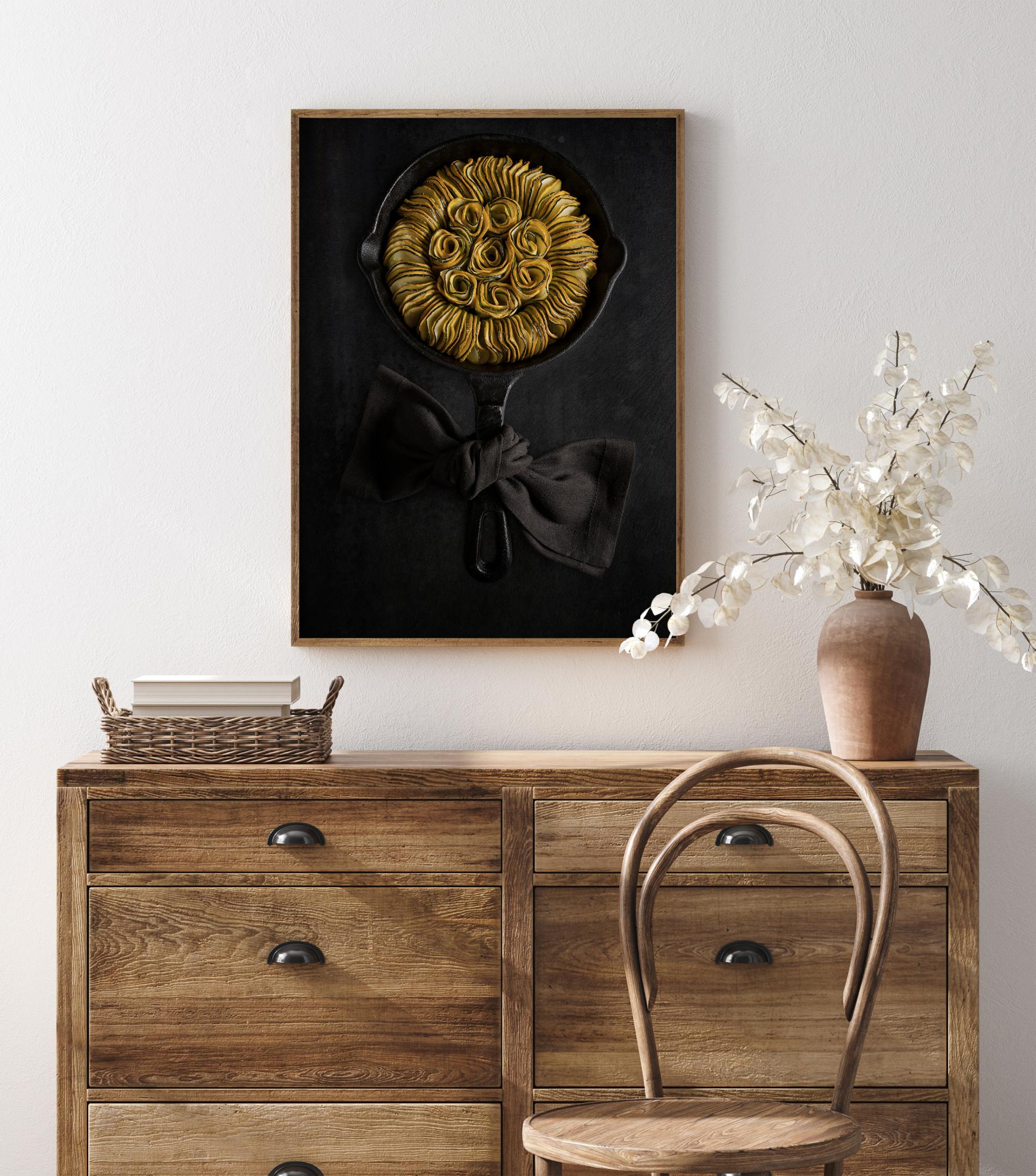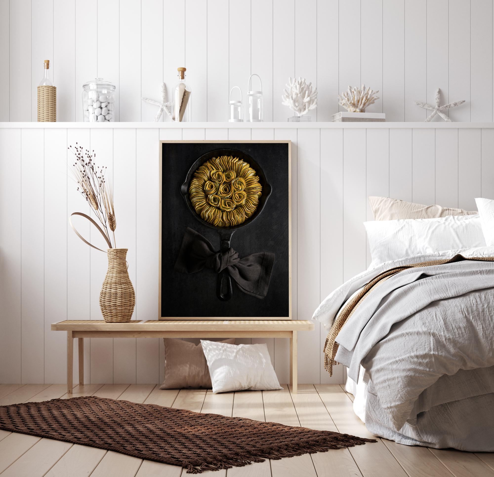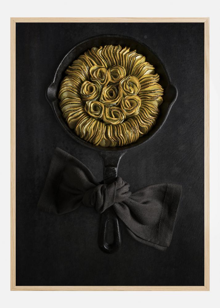 Okusen plakat z ratatouillejem z bučko ali bučo, ki je elegantno urejen v litoželezni ponvi in ustvarja čudovito obliko sončnice. Rumene in zelene bučke izstopajo proti črni ponvi s tekstilnim trakom, zavezanim okoli ročaja. Obesite ga v svoji kuhinji in preverite, ali lahko pripravite to privlačno jed.
